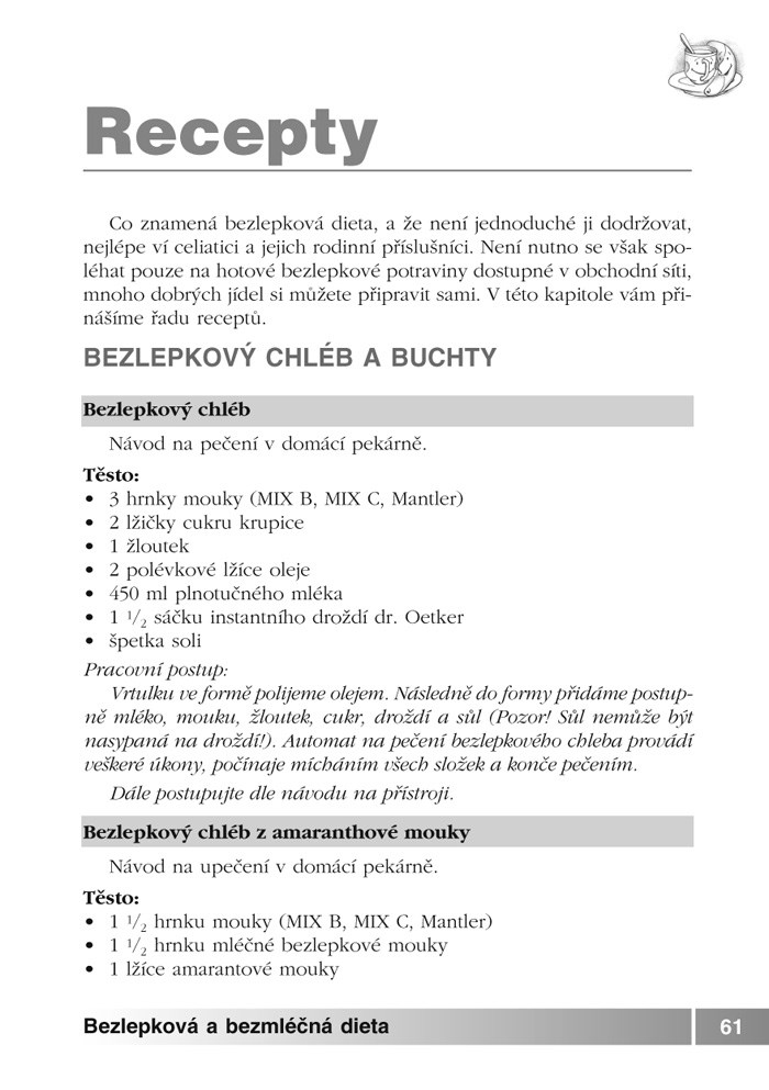 Odpovědi na nejčastější otázky, seznam E (přídatných látek v potravinách), legislativa v ČR a na Slovensku týkající se občanů s bezlepkovou dietou, velké množství nových zajímavých receptů na bezlepkové pečivo, zákusky a cukroví. To vše naleznete v této příručce. Kniha je vhodná také pro odbornou veřejnost, protože obsahuje také podrobnější rozbor příčin, klinických projevů a následků.