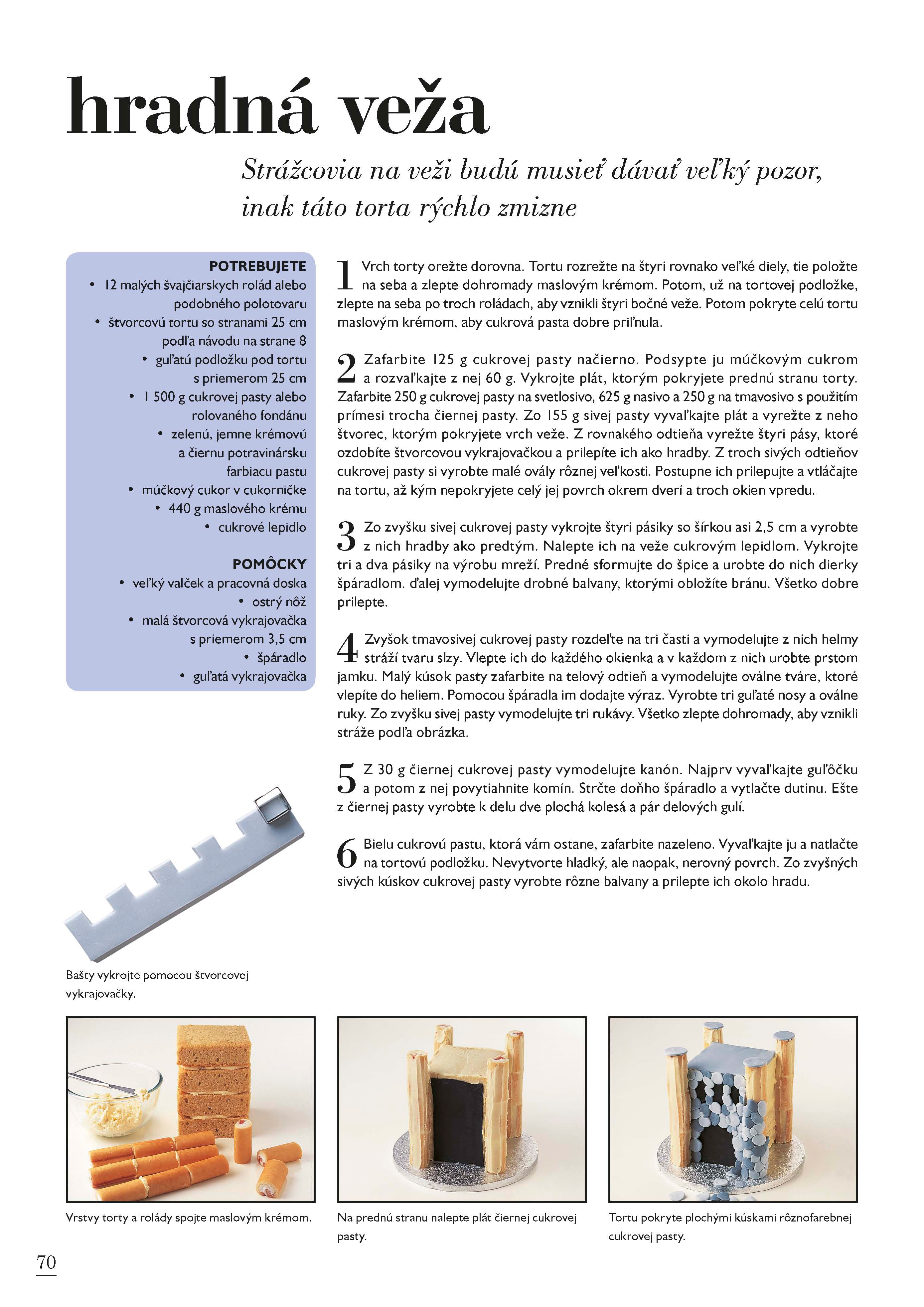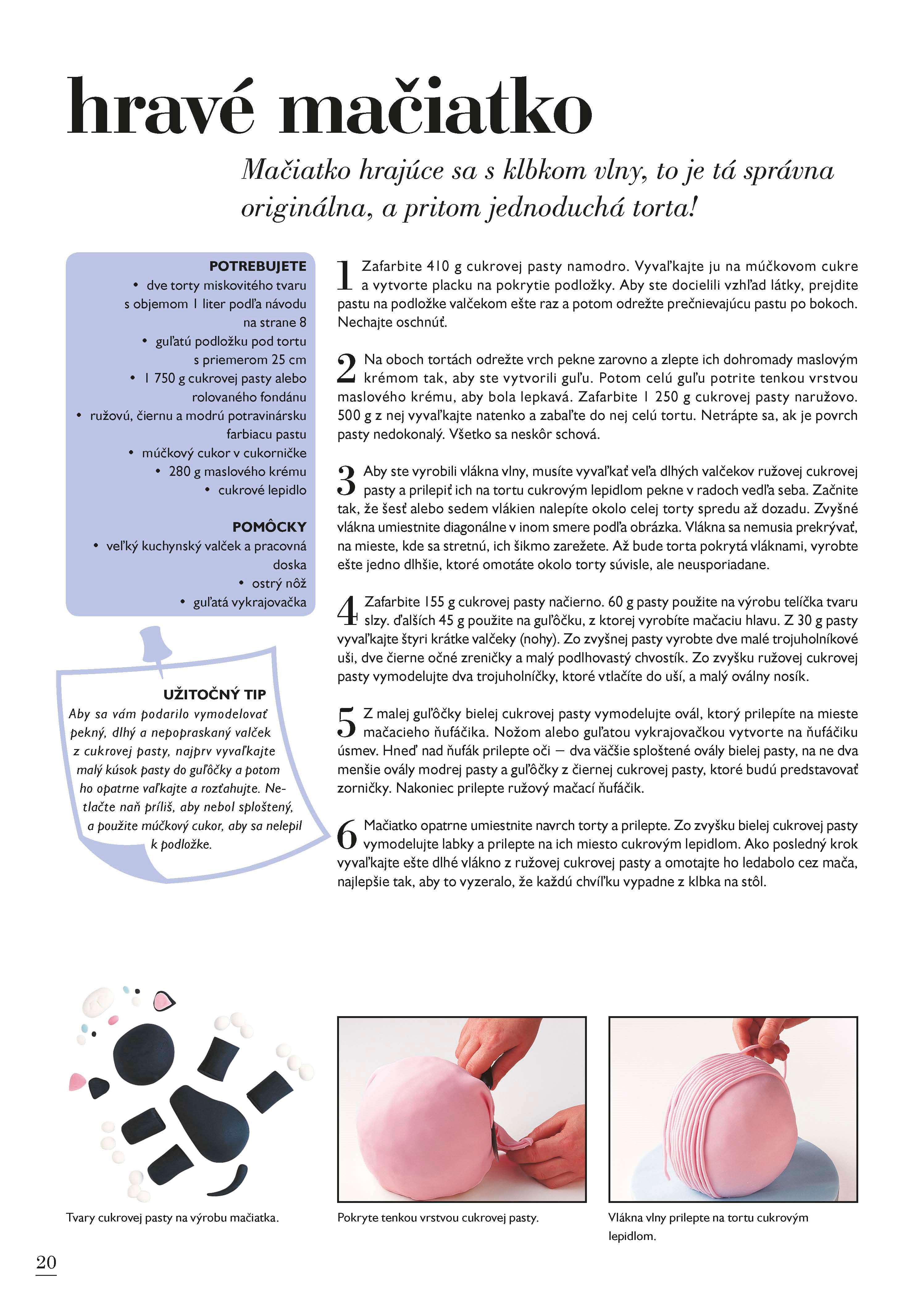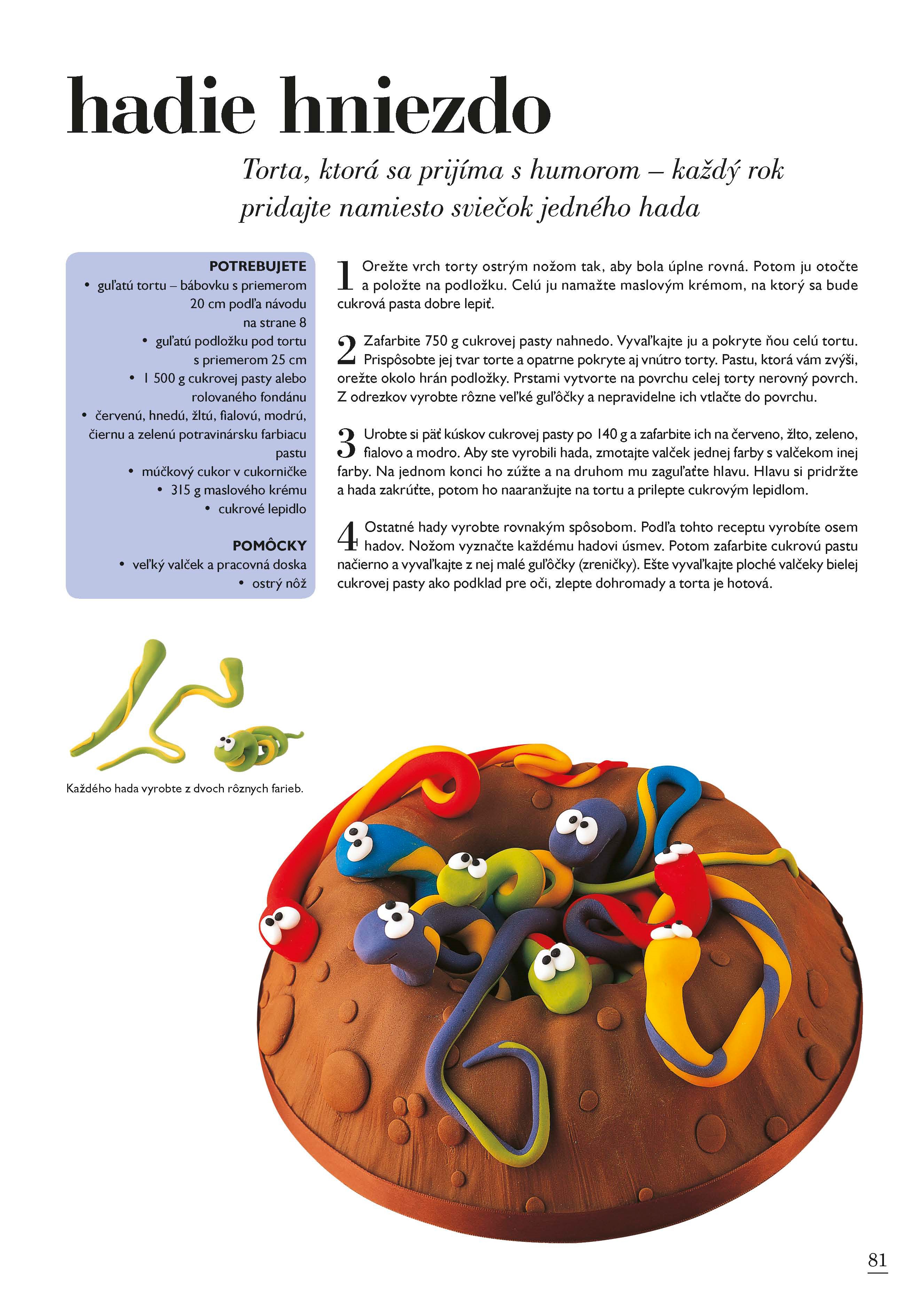 Kniha 50 tipov na detskú tortu je svojím obsahom zameraná na deti všetkých vekových kategórií. Zamilujú si priateľskú žabku, pavúka alebo Noemovu archu. Športovci si budú užívať futbalového fanúšika alebo formulu 1, deti naozaj s veľkou fantáziou ocenia lietajúce ufo, chalúpku pre víli, alebo škvrnitého draka. Staršie slečny zabavíte malou trblietavou taštičkou s make-upom a tí najmenší budú obdivovať hravé mačiatko zamotané do klbka bavlny, alebo milučké žlté kuriatko.