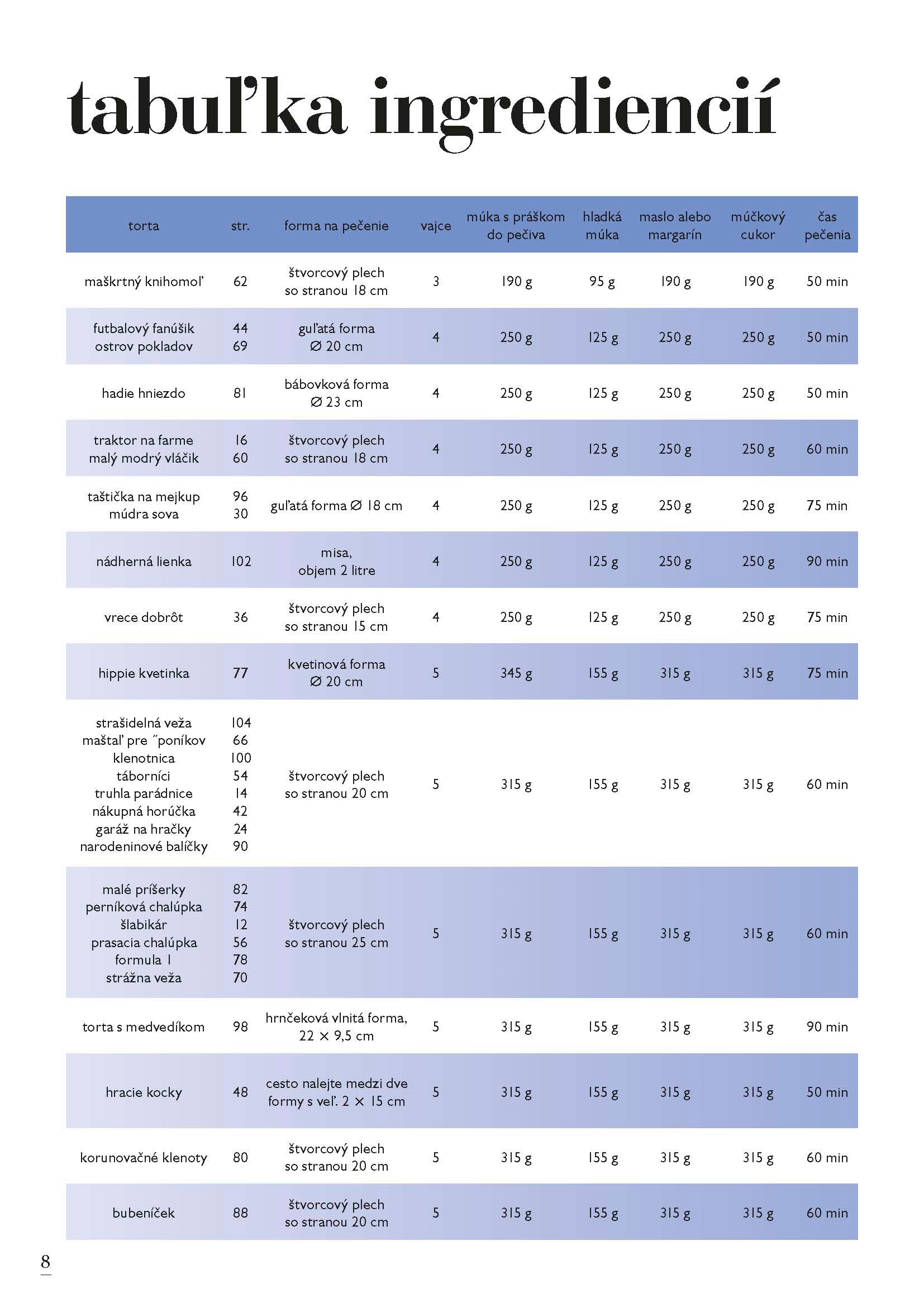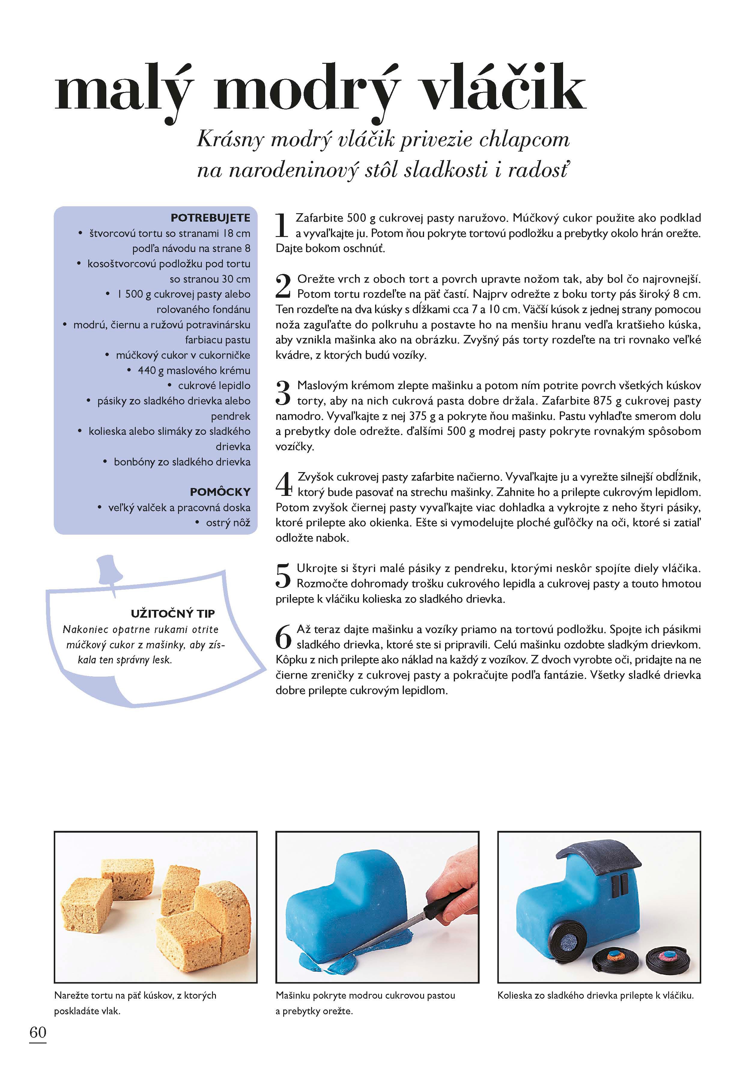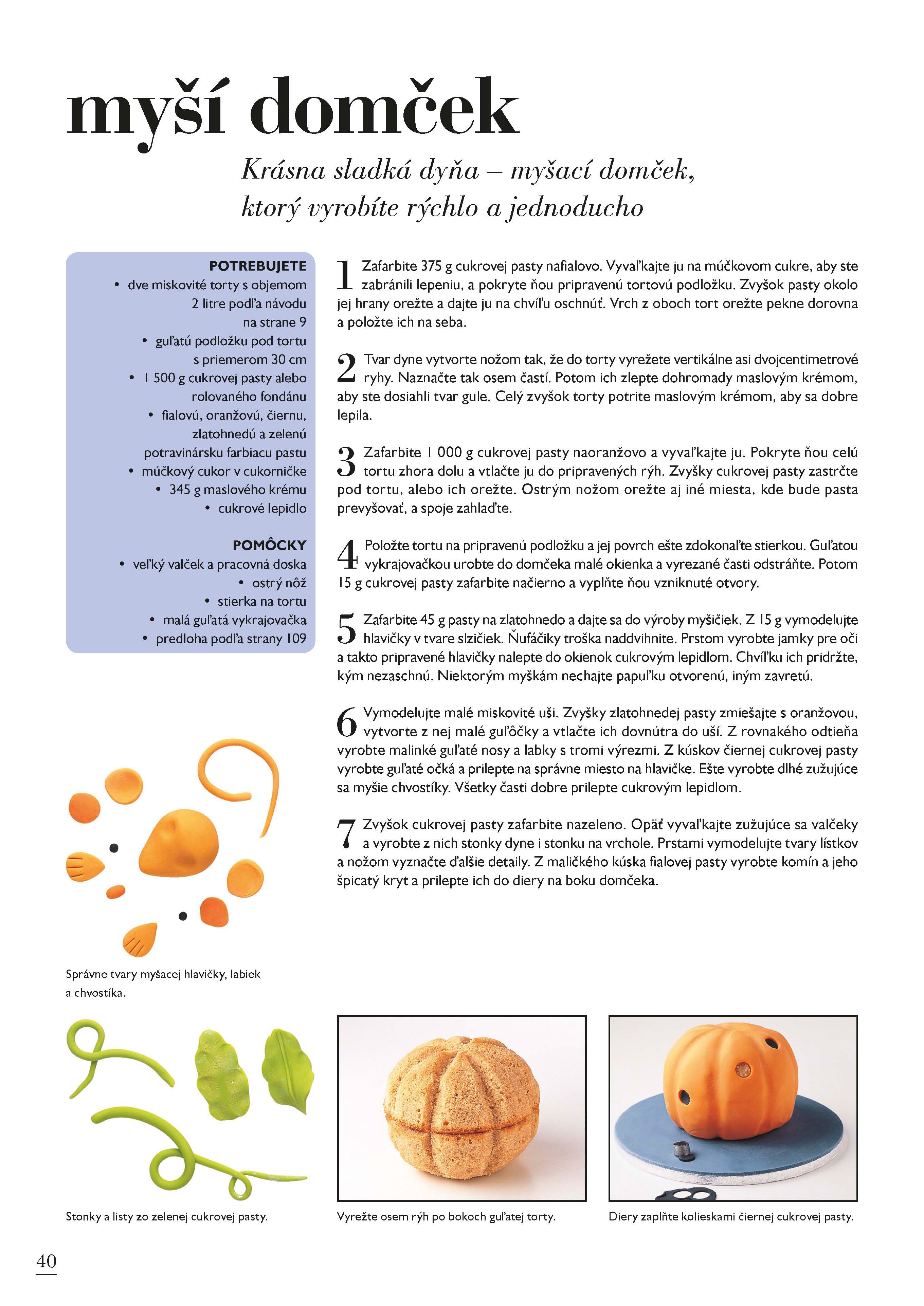 Kniha 50 tipov na detskú tortu je svojím obsahom zameraná na deti všetkých vekových kategórií. Zamilujú si priateľskú žabku, pavúka alebo Noemovu archu. Športovci si budú užívať futbalového fanúšika alebo formulu 1, deti naozaj s veľkou fantáziou ocenia lietajúce ufo, chalúpku pre víli, alebo škvrnitého draka. Staršie slečny zabavíte malou trblietavou taštičkou s make-upom a tí najmenší budú obdivovať hravé mačiatko zamotané do klbka bavlny, alebo milučké žlté kuriatko.