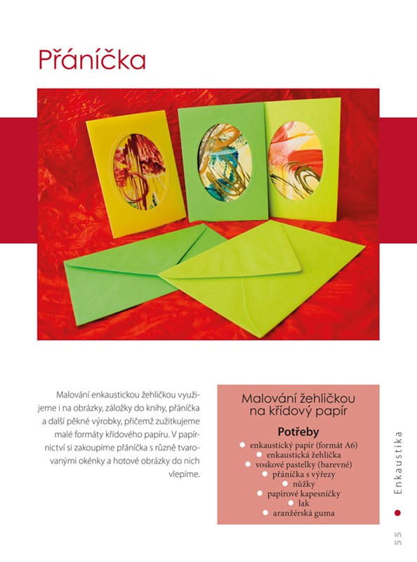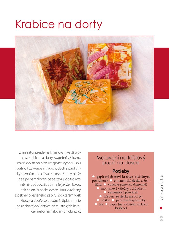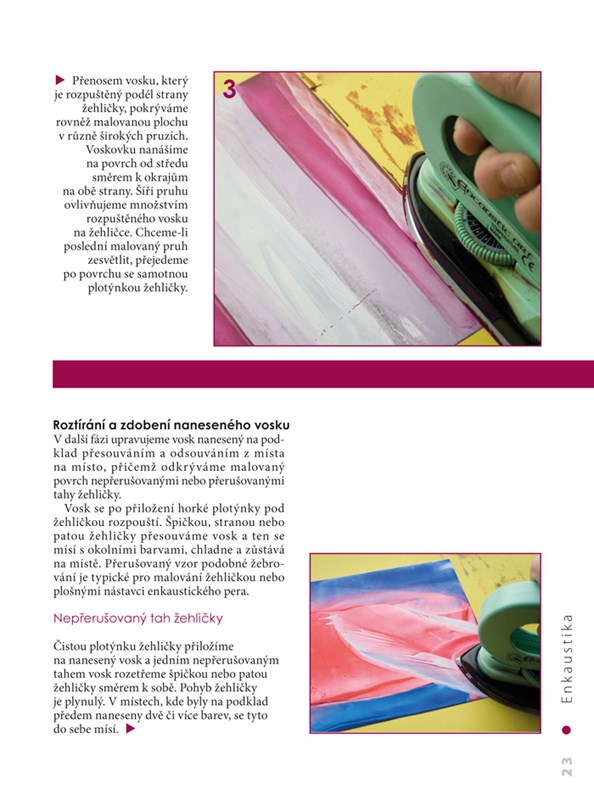 Pokud jste si oblíbili techniku malby a rádi byste si vyzkoušeli i její méně známé varianty, je tato kniha určena právě pro vás. Představí vám specifika techniky enkaustiky, při jejíž tvorbě se rozpuštěný barevný vosk pomocí speciálních enkaustických pomůcek (žehlička, pero, enkaustická deska apod.) nanáší na nejrůznější povrchy (papír, textil, dřevo, sklo, keramika, PVC apod.). Autorka vás nejdříve seznámí se všemi potřebnými pomůckami i materiály a poté se již bude plně věnovat jednotlivým enkaustickým technikám. Díky barevným fotografiím a názorným postupům už pak bude zhotovení některého z uvedených 12 projektů hračkou i pro úplné začátečníky v oblasti malování horkým voskem.