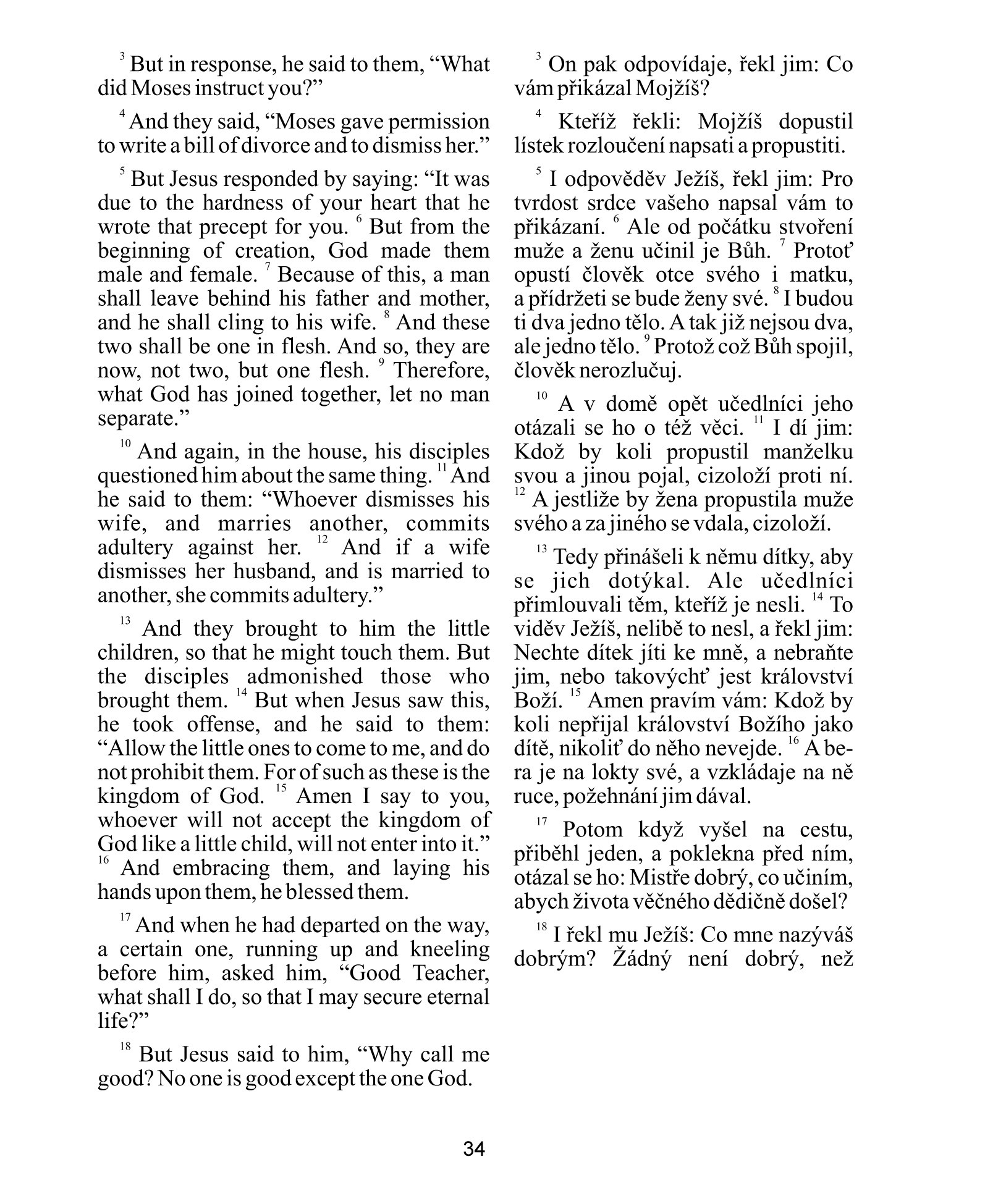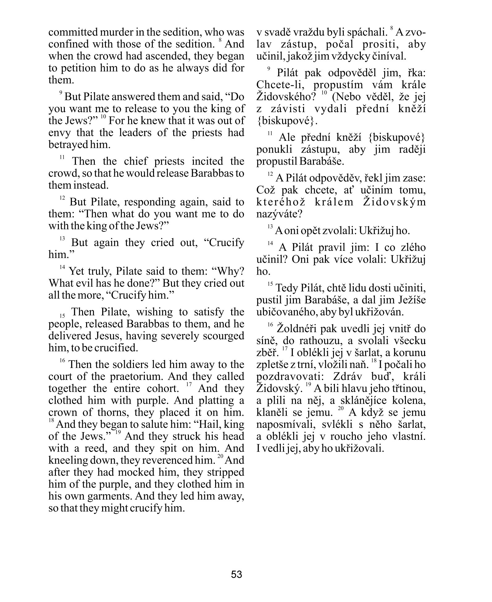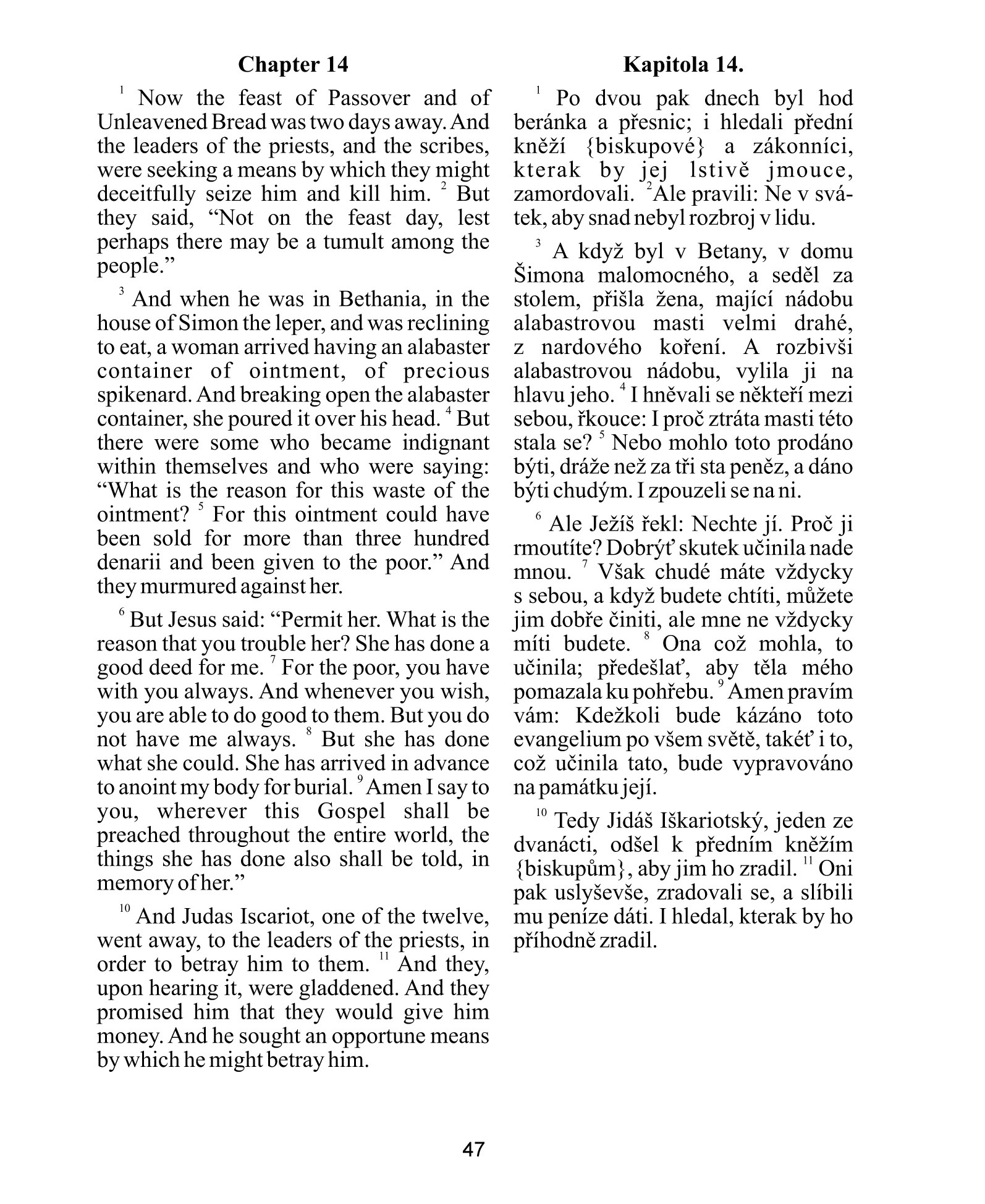 Naše anglicko-česká verze Markova evangelia je určena hlavně pro studenty. V levém sloupci naleznou anglický text, v pravém potom jeho český ekvivalent. Pokročilí angličtináři si tak mohou procvičit dovednosti prostřednictvím četby skutečné literární perly, svůj překlad ihned porovnat s textem napravo. CD obsahuje nahrávky ve formátu MP3.
