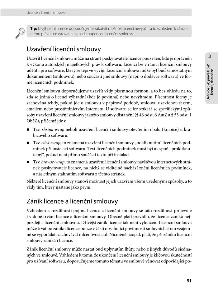 Zkušení advokáti se v knize věnují oblasti IT práva zaměřujícího se na tvorbu, dodávky a servis softwaru. Výklad srozumitelný i neprávníkům doplňují konkrétní příklady z praxe a ukázkové formulace smluv ve všech důležitých oblastech softwarového práva. Autoři se věnují také popisům možných rizik a tomu, jak se s nimi vyrovnat. Kniha je určena IT manažerům, programátorům i zákazníkům a právníkům IT firem.