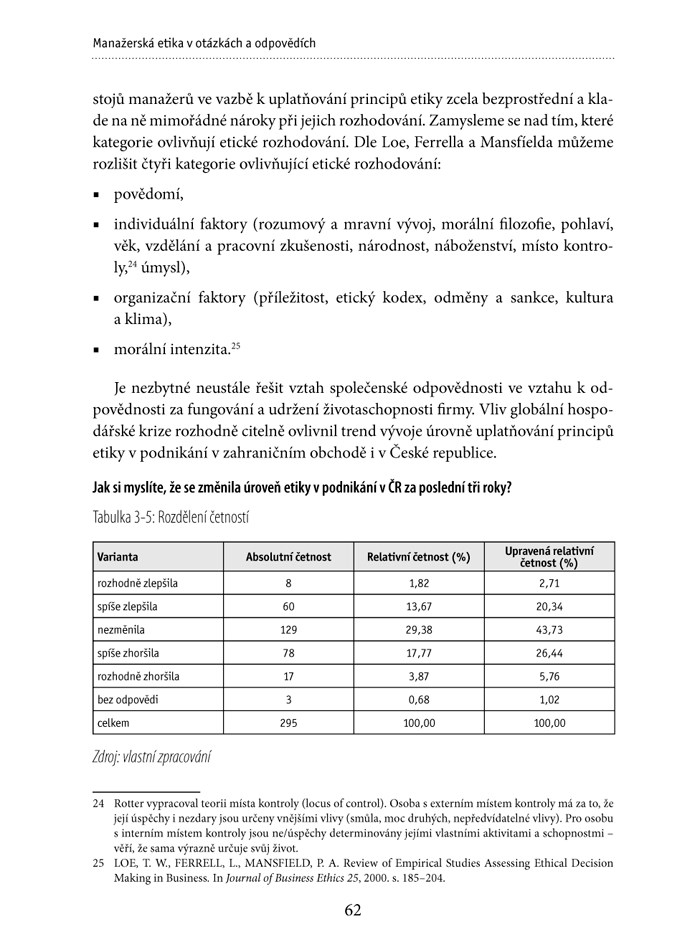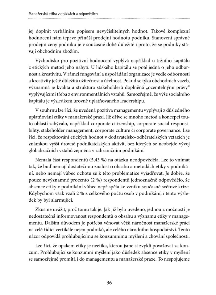 „Kniha Manažerská etika v otázkách a odpovědích zkoumá na relevantním vzorku respondentů povědomí o významu manažerské etiky a zájem aplikovat etiku do manažerské praxe. Publikace přináší důležité poznatky o stavu etiky v managementu, autoři podávají k jednotlivým otázkám vysvětlení jak z hlediska teorie, tak i z pohledu praktického uplatnění.