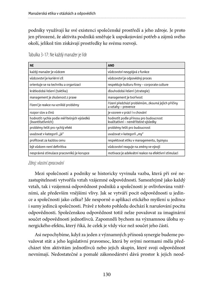 Publikace je přínosem jak pro budoucí ekonomy, tak i pro praktikující manažery, které inspiruje ke zkvalitnění řídících činností. Poukazuje na to, že manažerskou etiku je třeba chápat jako inovaci manažerské teorie a prevenci prohlubování konzumního myšlení společnosti.“