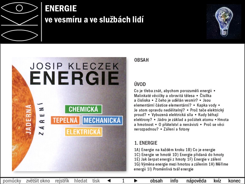 Publikace edice OKO, která je věnována energii, její podstatě, formám a využití, vychází nyní v nové podobě na CD-ROMu. Chronologicky řazené kapitoly přinášejí věcný a srozumitelný přehled základních vědomostí z oblasti, která se dotýká každého z nás. Tento CD-ROM je užitečnou pomůckou pro výuku, především v hodinách fyziky a biologie a jako vždy je pro vás na CD z edice OKO připravena kvízová soutěž.