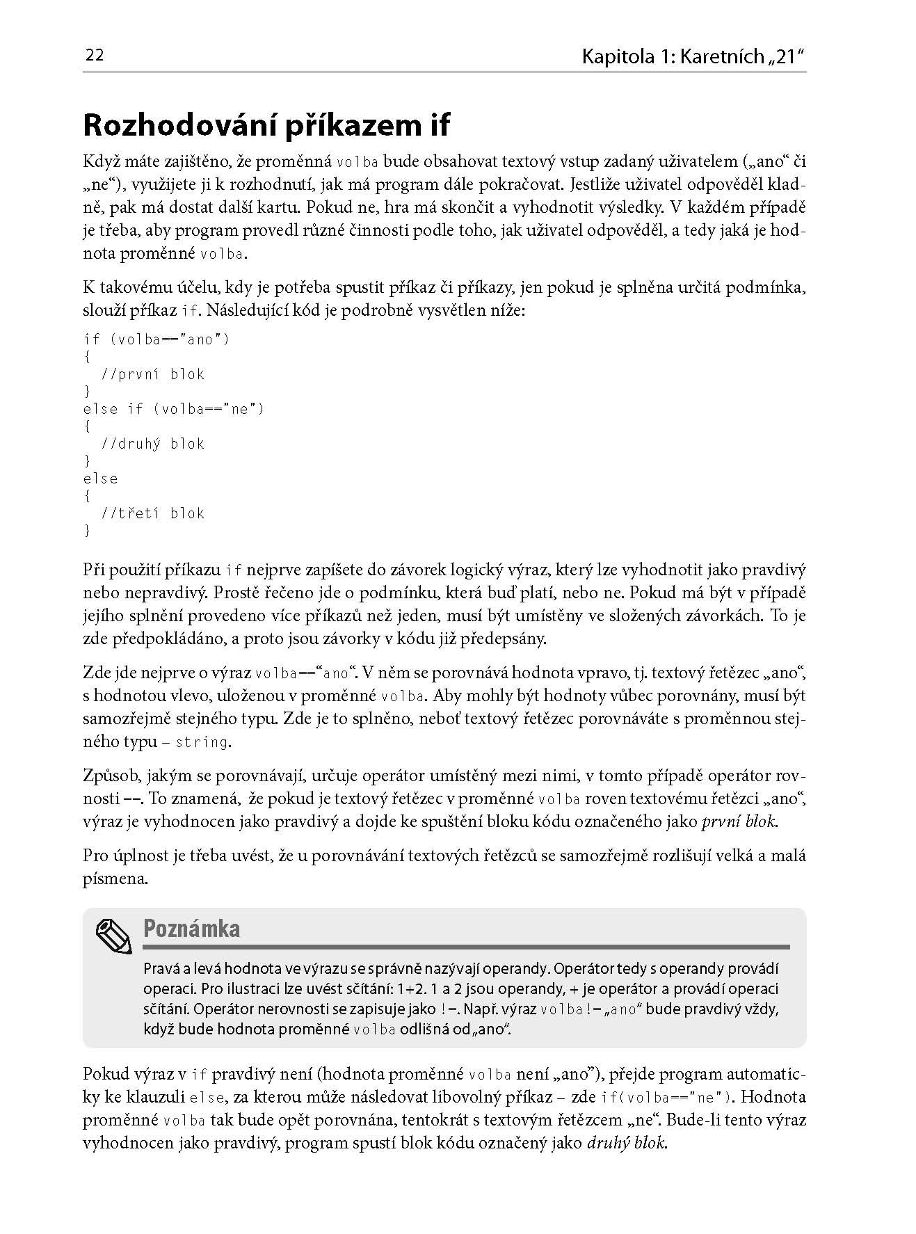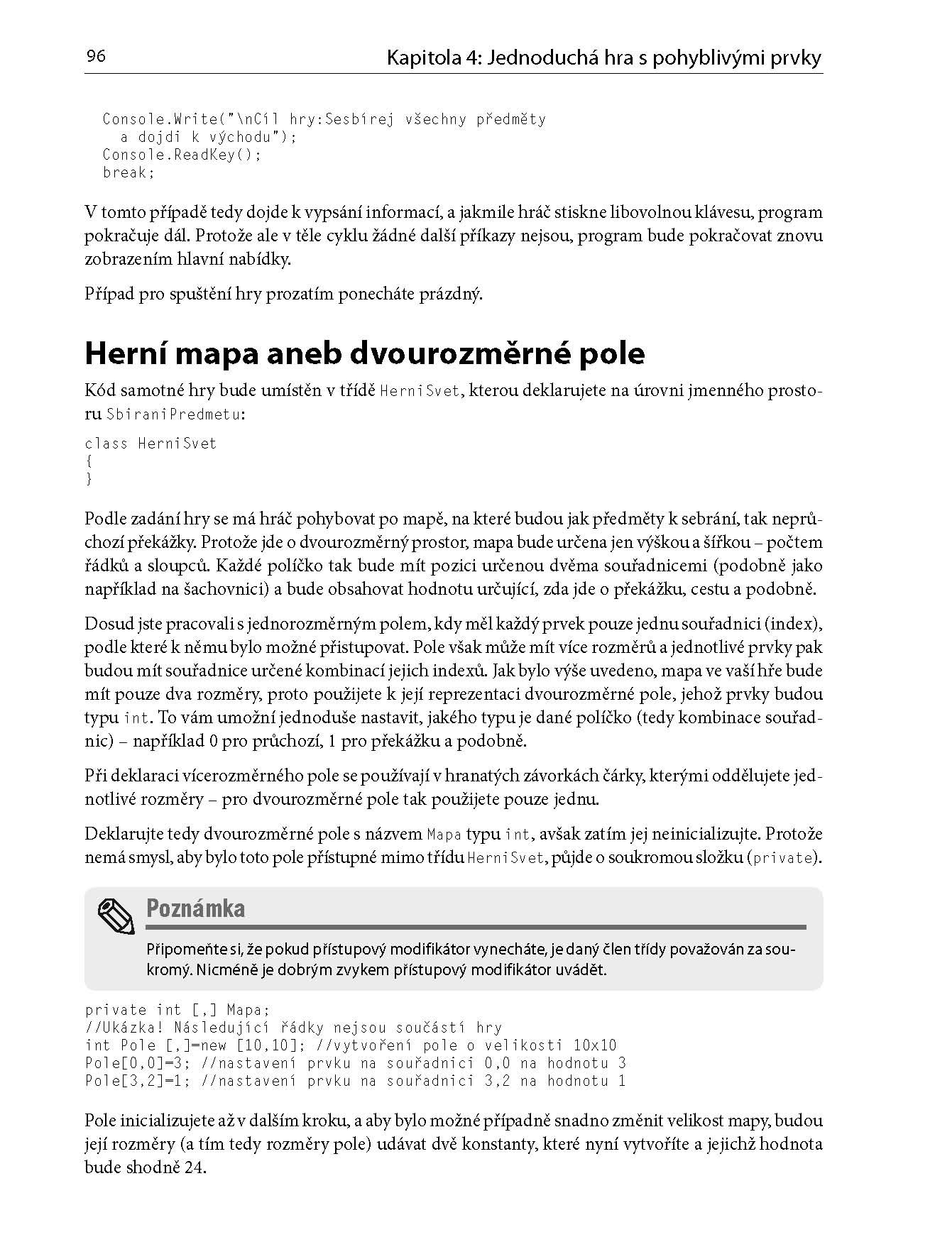 Dvojice autorů vás zábavnou formou výuky seznámí se základy C#. Každá z devíti kapitol představuje ucelený projekt, na kterém se postupně naučíte pracovat se základními i pokročilými konstrukcemi jazyka. Kniha obsahuje minimum teorie, veškeré nové informace jsou čtenáři předkládány na praktické bázi v podobě nové funkčnosti právě rozpracované hry. Při vývoji postupujete krok za krokem a vytváříte hru zcela od začátku až po hotový výsledek.