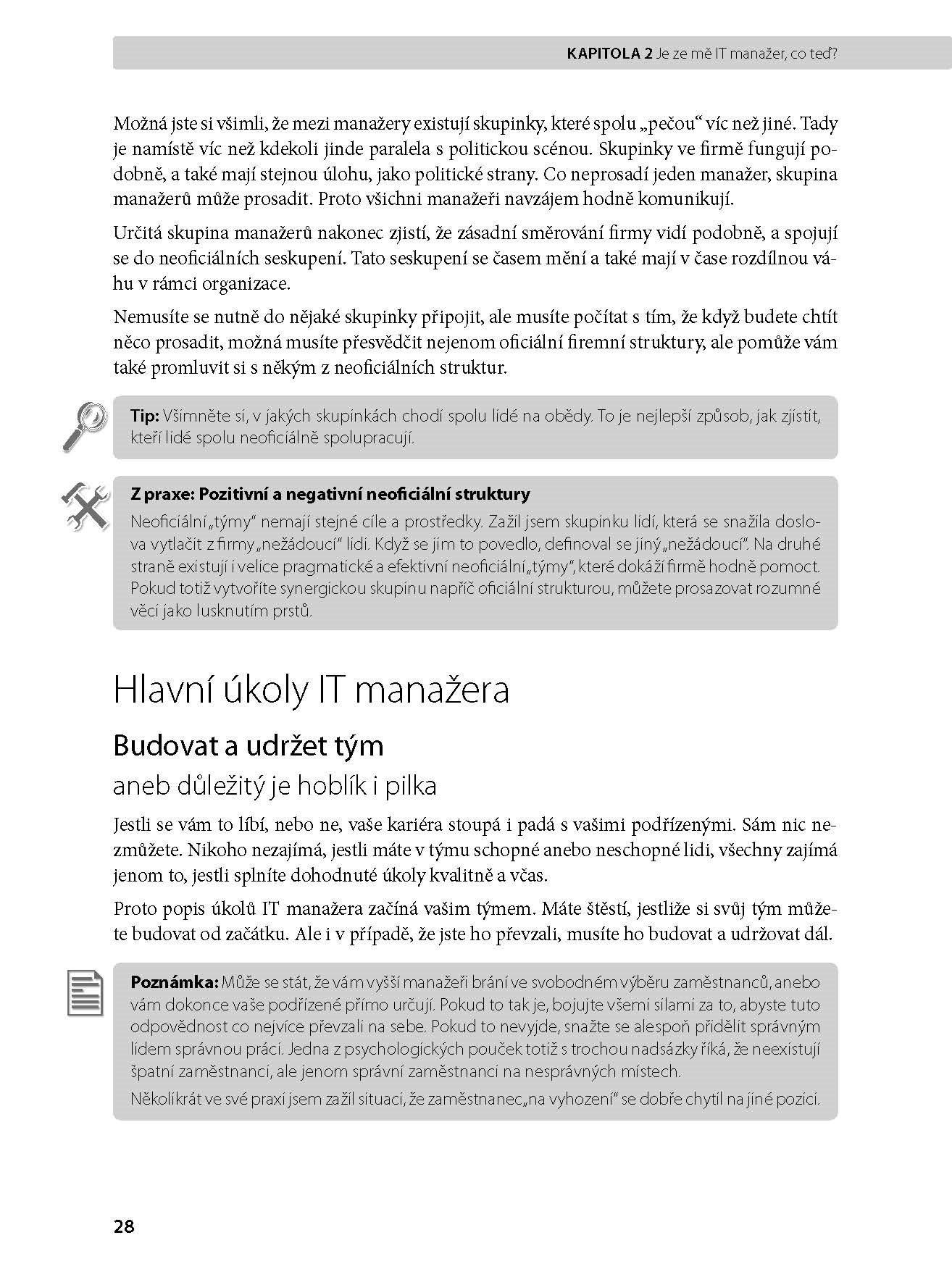 Autor s letitou praxí na pozici IT manažera vám velmi čtivou a odlehčenou formou ukáže úskalí, jimž jako IT manažer můžete čelit, a poradí, jak se jim vyhnout. Výklad je navíc protkán desítkami tipů a příkladů. Nezřídka narazíte i na skutečné historky, které autor nebo jeho přátelé zažili přímo v praxi. Na konci každé kapitoly naleznete shrnutí probírané látky a otázky, které vás mohou motivovat k dalšímu zamyšlení.