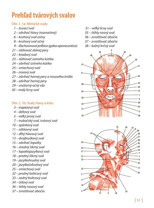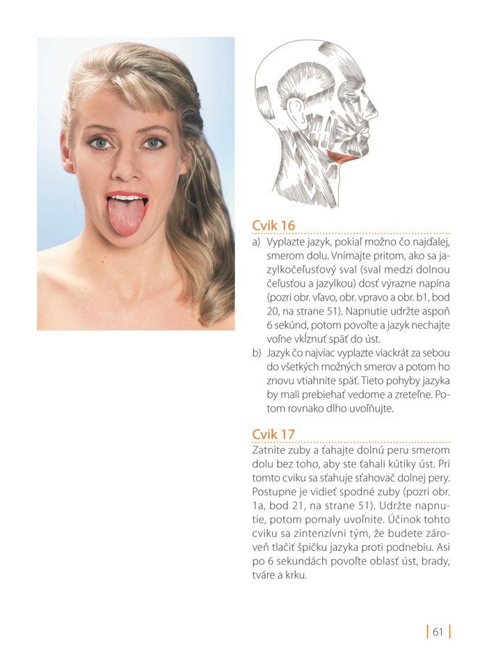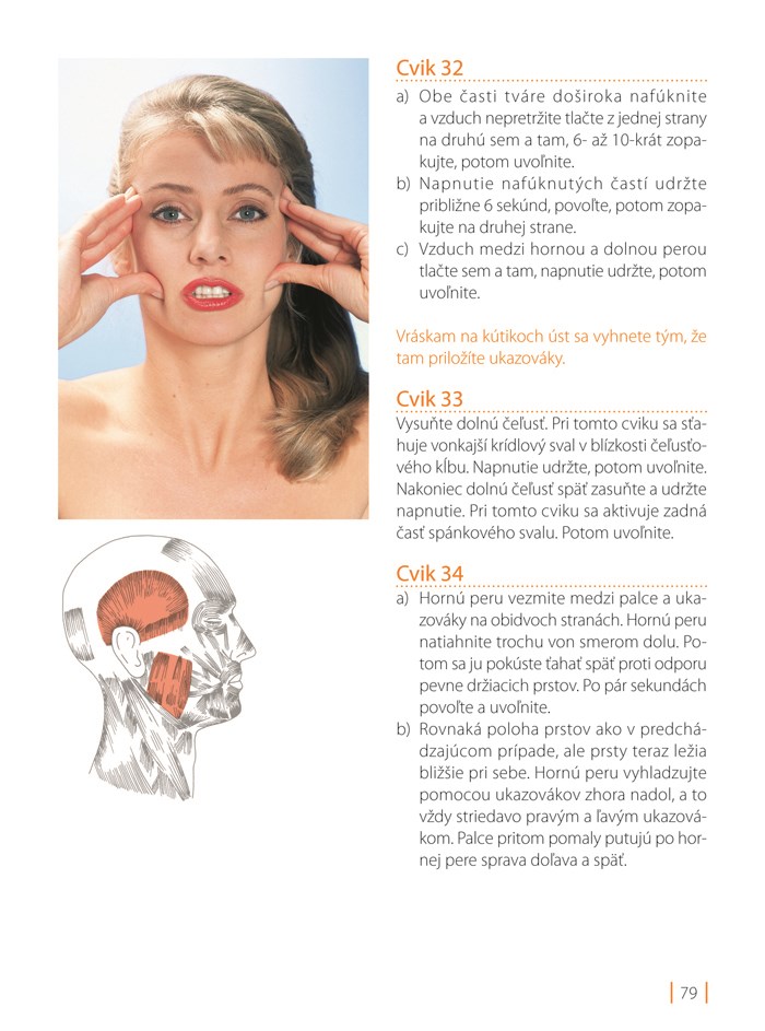 • Mimické cviky pre jednotlivé partie tváre a krku (tvár, čelo, okolie očí, úst, pier).