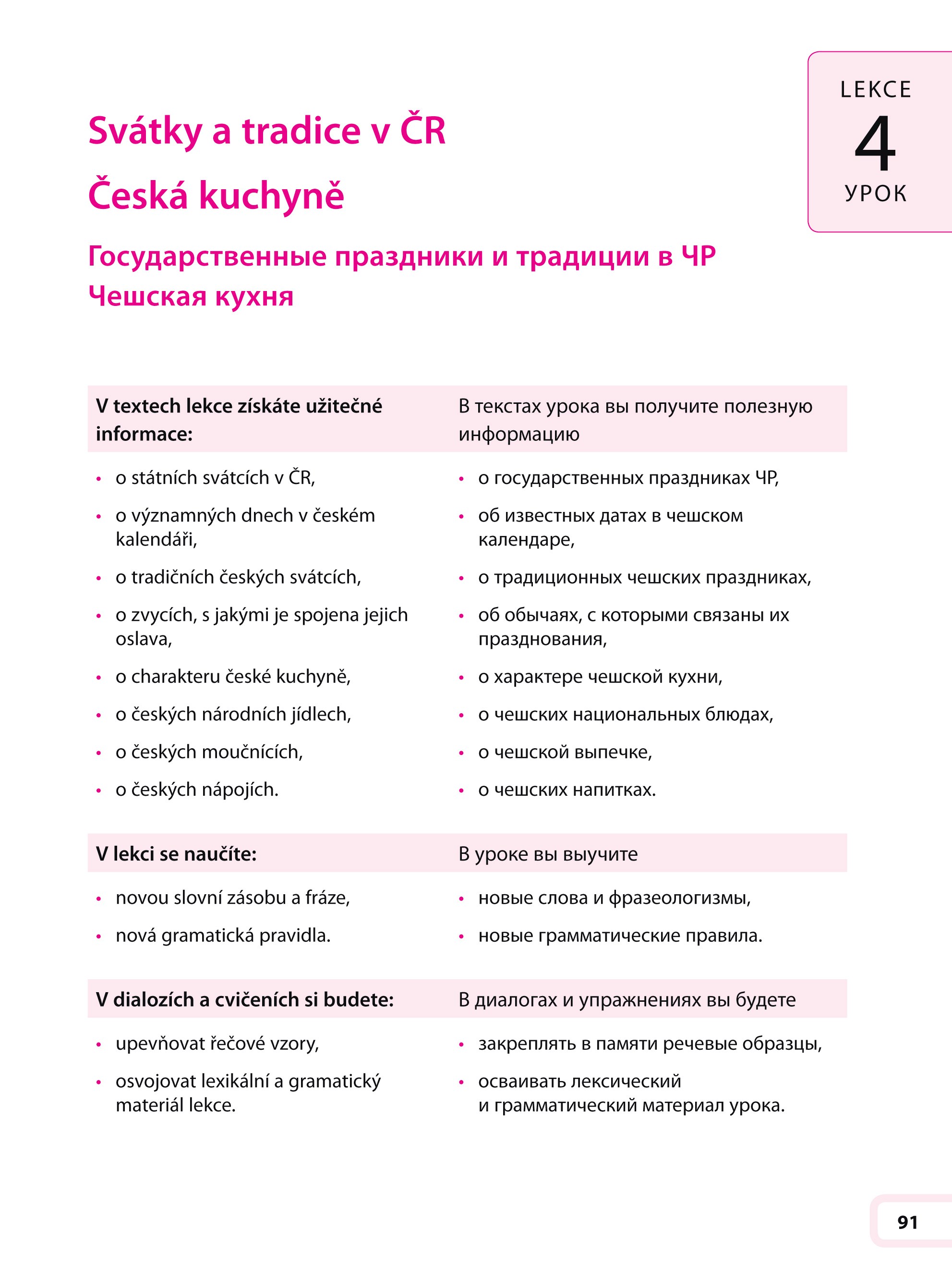 Učebnice je určena cizincům z Ruska, Ukrajiny, Běloruska a dalších států SNS, kteří přijíždějí do České republiky ? chtějí si osvojit v krátké době češtinu pro základní komunikaci s Čechy v běžných každodenních situacích, zvládnout základy české gramatiky a získat povědomí o sociokulturních zvláštnostech života v ČR, které jsou důležité pro počáteční adaptaci v českém prostředí. Lekce obsahují texty napomáhající cizincům s adaptací v ČR, slovní zásobu, autentické dialogy, frazeologii, gramatické komentáře, cvičení.