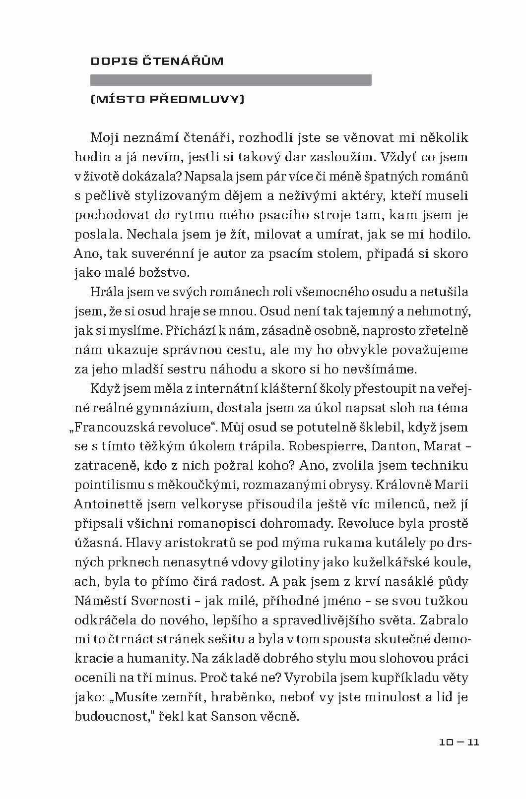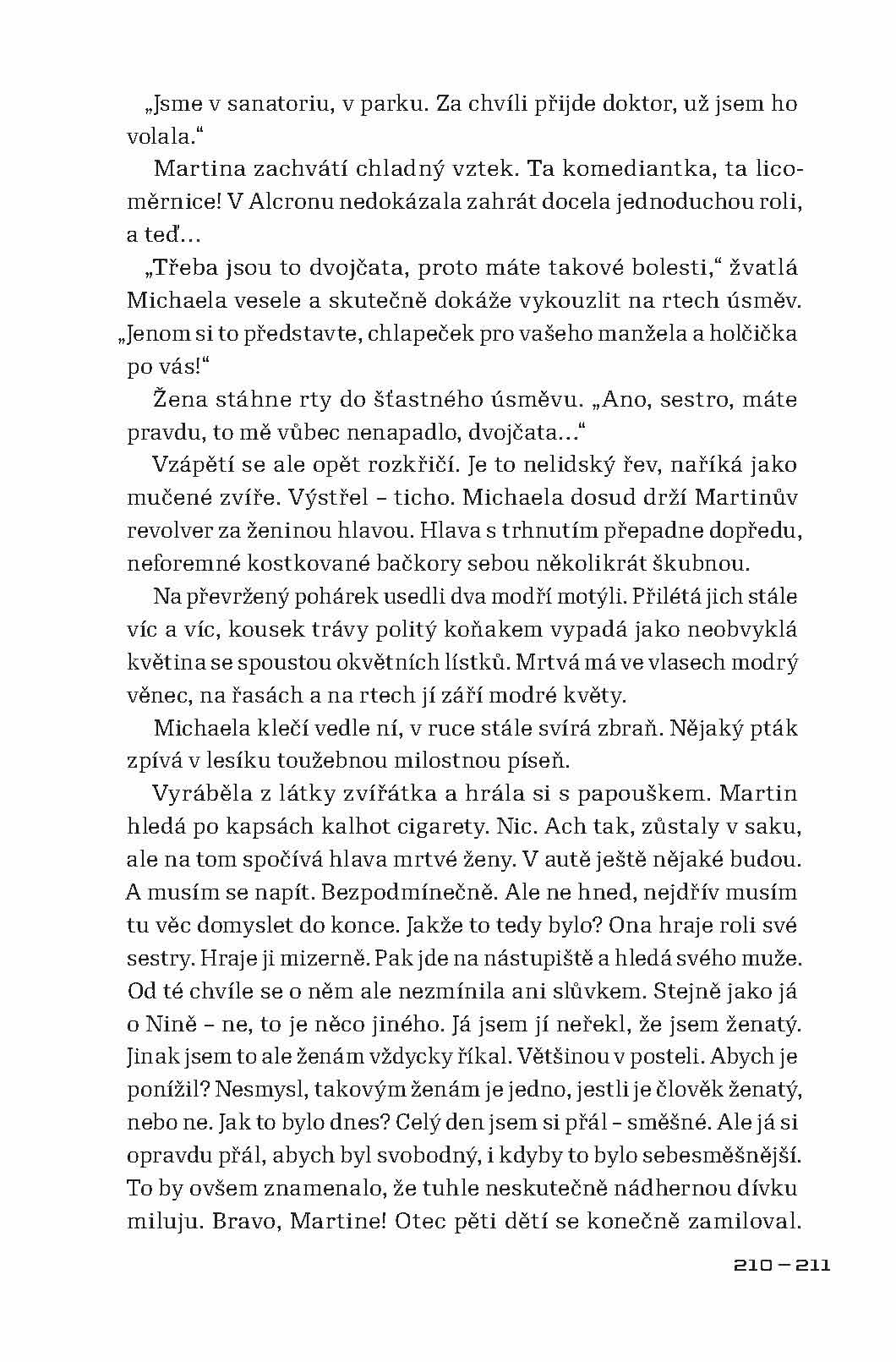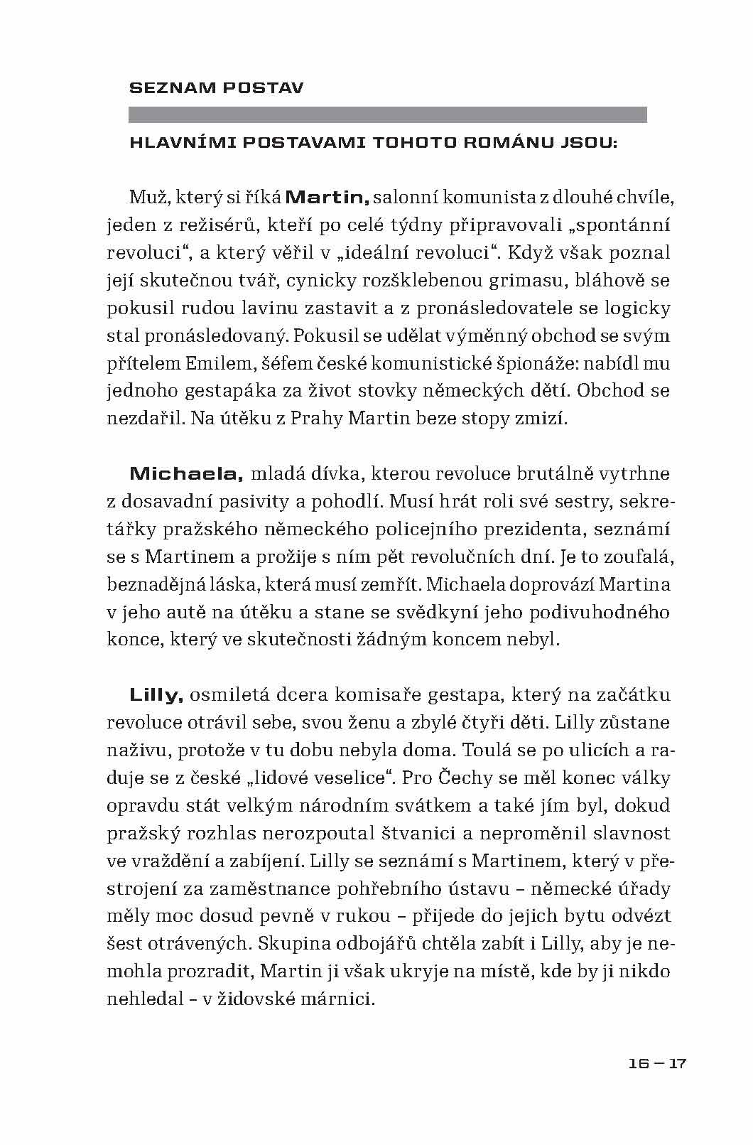 Román autorky, o jejíchž životních osudech se skoro nic neví, vypráví o dnech Pražského povstání v květnu roku 1945. Autorčin pohled, založený na osobních vzpomínkách, je mírně řečeno velice neobvyklý. Popisují se v ní krutosti páchané Revolučními gardami nejen na německém civilním obyvatelstvu, ale i na Češích, kteří jen v nejmenším nesouhlasili s tím, co gardisté provádějí, a proti jejich řádění se postavili. Hlavním viníkem těchto hrůz byl podle autorky Pražský rozhlas, který svým bezdůvodným štvaním způsobil, že v těch několika dnech přišly o život desítky tisíc lidí. Památný boj o rozhlas byl podle ní jen zinscenovanou provokací, jež měla vyvolat vražedné běsnění a rabování. Květnové povstání bylo v jejích očích motivované pouze mstou, potřebou kolaborantů zamést za sebou stopy a ambicemi těch, kteří v konci války spatřovali možnost, jak se dostat k moci a bohatství.