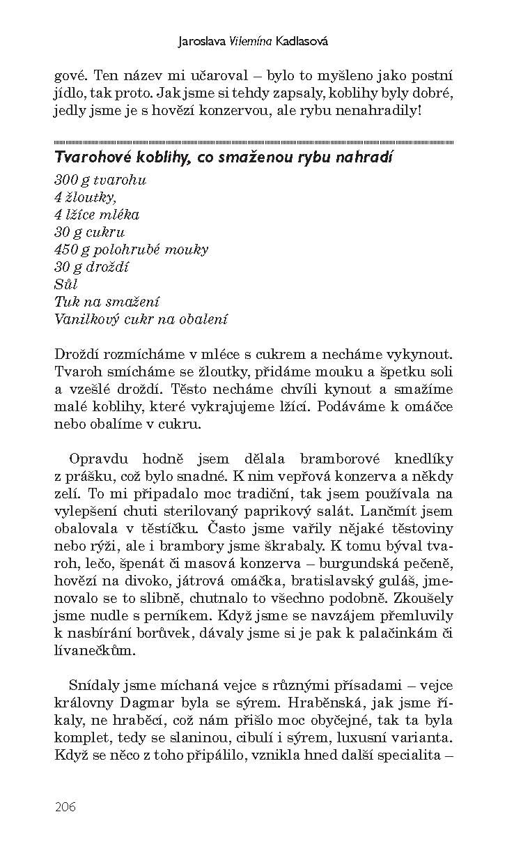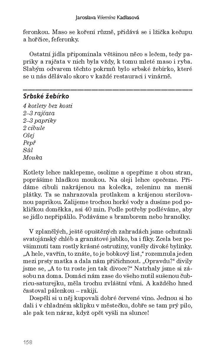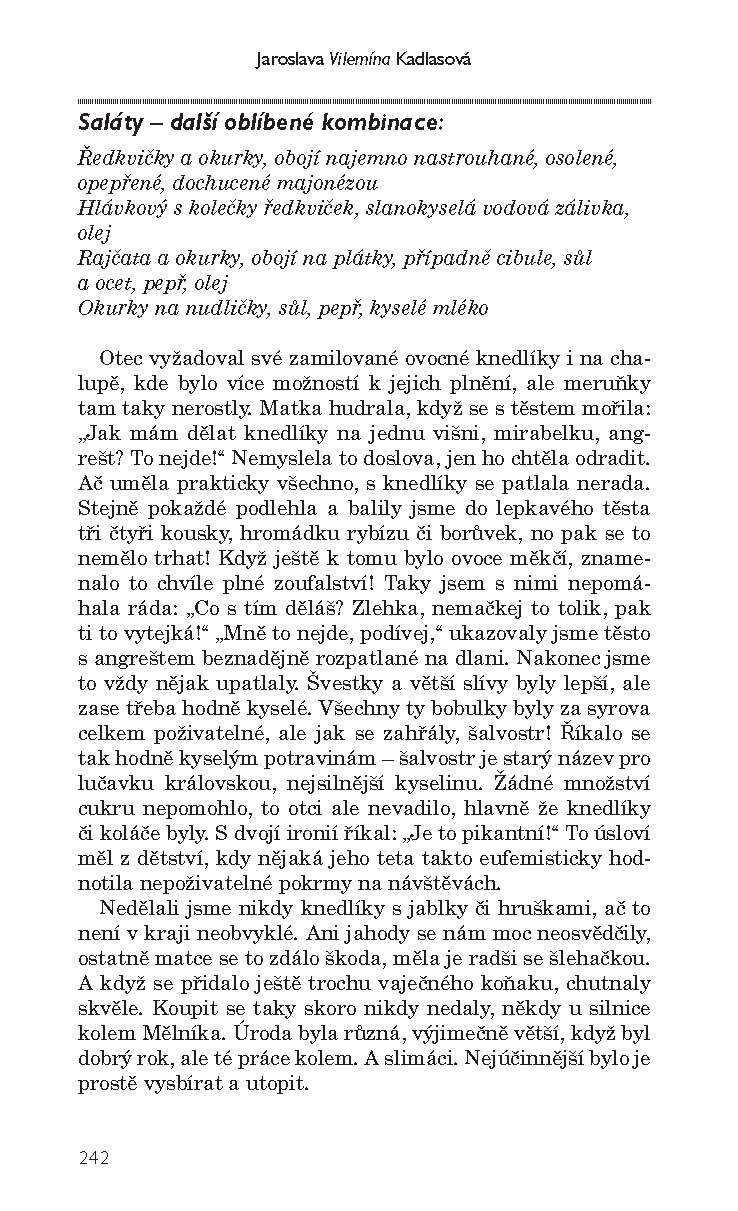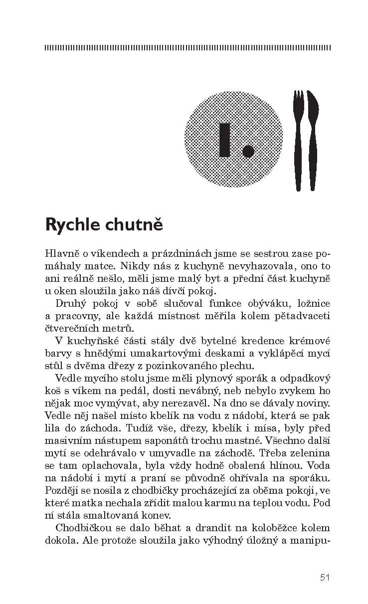 Ve své knize se autorka vrací do dětství, dob studií a dospívání. Nechá čtenáře nahlédnout do chodu netuctové domácnosti v době normalizace a barvitě zavzpomíná, co ji přivedlo k vaření, celoživotně největšímu koníčku. S milým nadhledem vypráví, jak ji od kolébky ovlivňovaly nezdolné ženy předchozích generací, které si dovedly poradit v každé situaci, a také prozradí, k čemu je dobrý cukr na nitku. Co, jak a z čeho se vařilo, dokládá na 130 autentických dobových receptech, podle nichž si můžete uvařit například „sacher“ z kefíru, bůčkové placky, domácí debrecínku, socialistické špagety po milánsku či tříbarevnou buchtu.