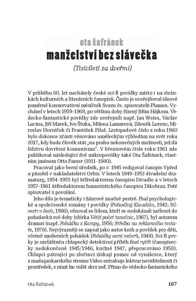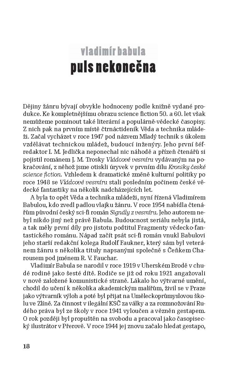 Pro mnohé čtenáře bude překvapením, kolik neznámých povídek a autorů zůstalo zapomenuto na stránkách dobových časopisů ze 60. let. Úvodní slovo a výběr povídek také ukáže, že počátkem 60. let byla sci-fi vnímána jako legitimní součást literatury hlavního proudu. Běžně vycházela v mainstreamových literárních periodikách typu Květen, Host do domu či Plamen a psali ji renomovaní autoři. Teprve koncem 60. let vznikají povídkové sbírky, v nichž převládá zábavná složka tohoto žánru. V antologii nechybí ani vítězné povídky z unikátní mezinárodní soutěže o nejlepší sci-fi povídku, které se z ČSSR zúčastnil v roce 1962 časopis Věda a technika mládeži.