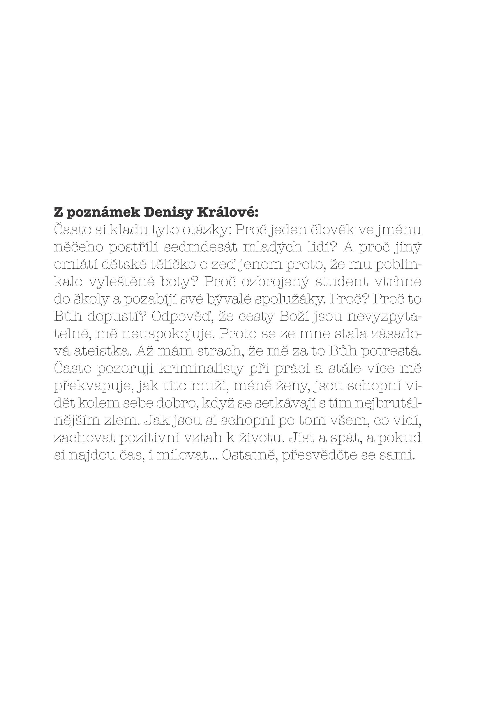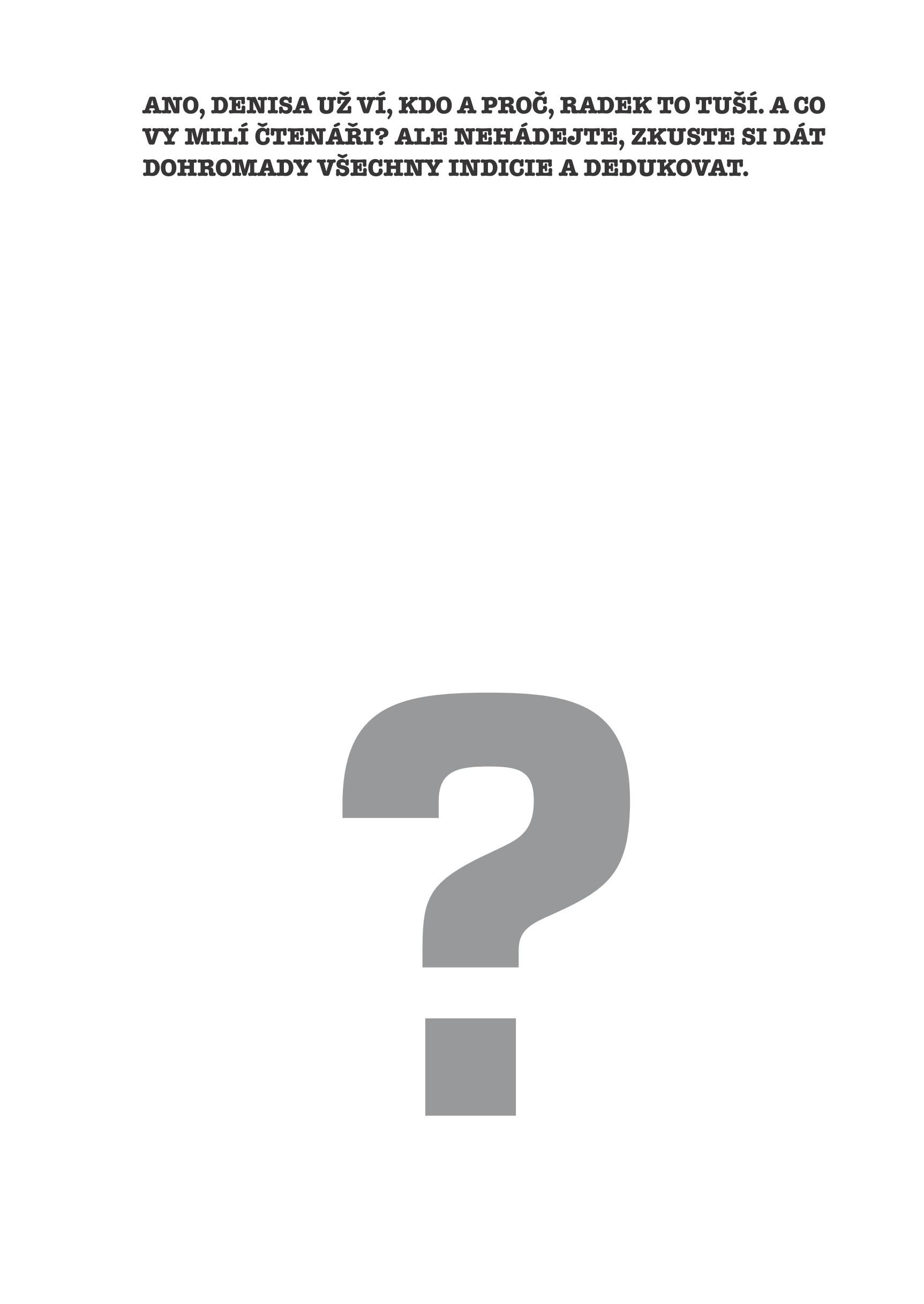 Sedm nových detektivních příběhů s hádankou, sepsané ve stejném duchu, jak je znáte z úspěšného televizního cyklu. Průvodkyní vám bude reportérka Denisa Králová, která se věnuje kriminálním kauzám a tak trochu si hraje na detektiva s kamerou a mikrofonem.