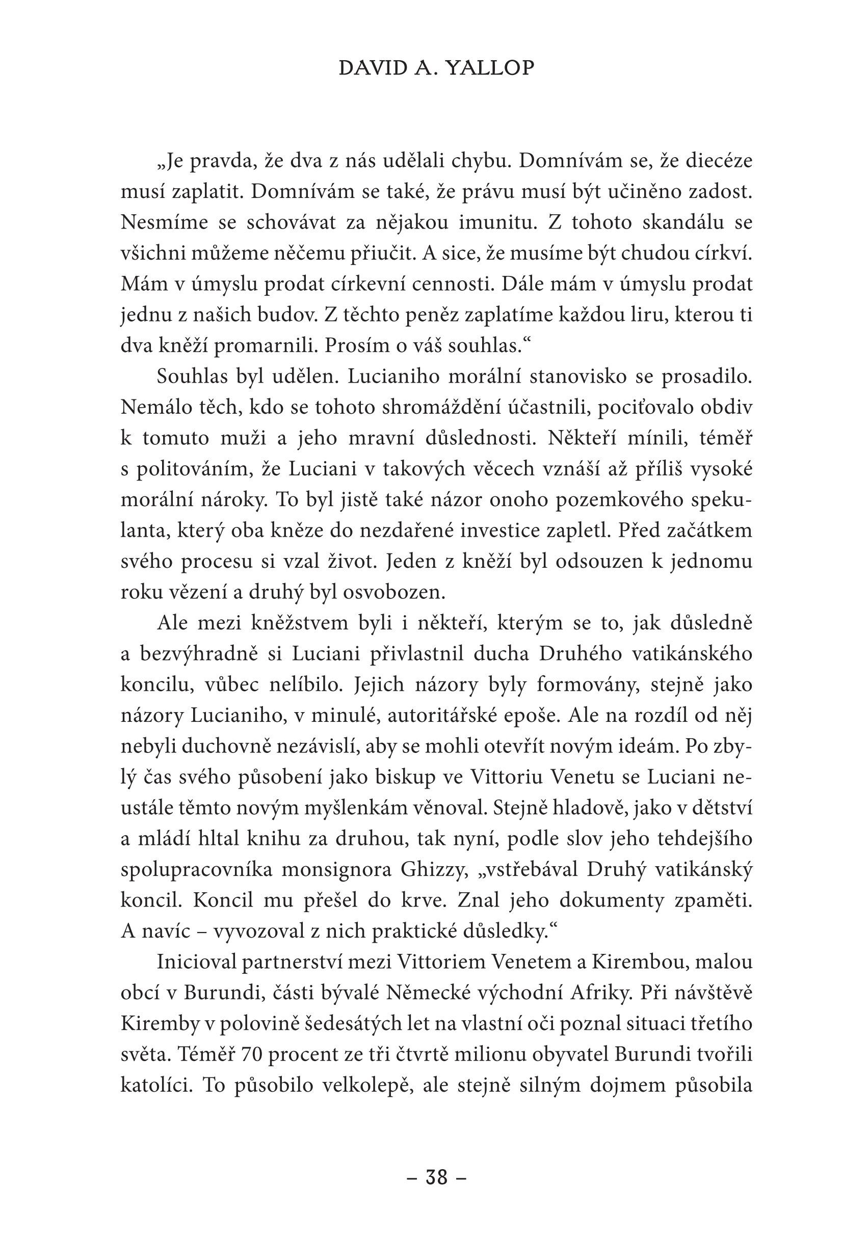 Dne 26. srpna 1978 se Albino Luciani stal 263. papežem, zvolil si jméno Jan Pavel I. a pustil se do změn, které měly za cíl reformovat církevní pořádky. Po třiatřiceti dnech pontifikátu však poměrně mladý a do té doby zdravý papež zemřel… David A. Yallop v knize, jež je výsledkem jeho dlouholeté práce, rešerší, rozhovorů s vysokými představiteli církve a pátrání v archivech, rozplétá podivnou celosvětovou pavučinu lží a intrik, finančních machinací a zákulisních bojů mezi členy kurie. To může být vodítkem k odpovědi, co se tu osudnou noc doopravdy stalo…