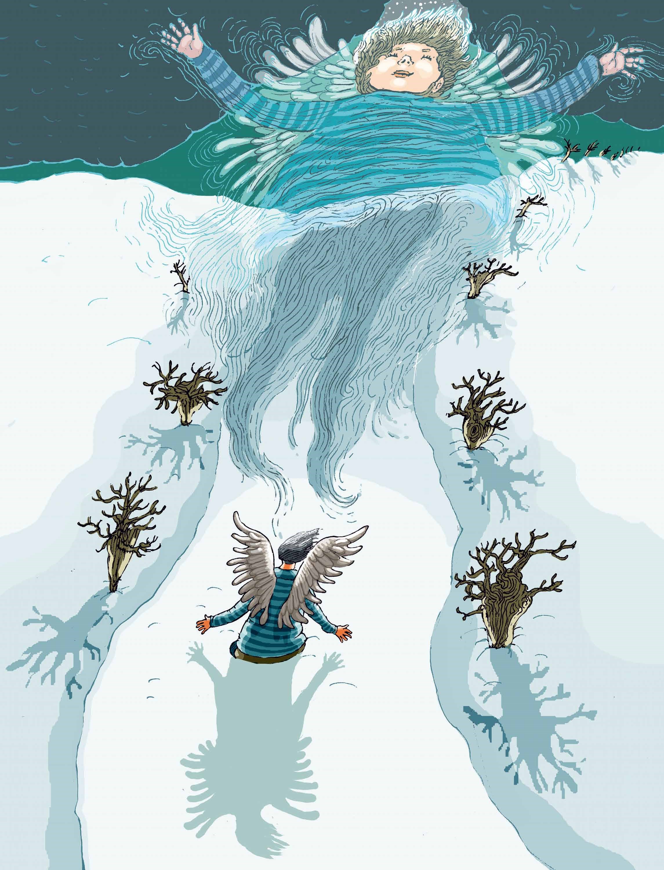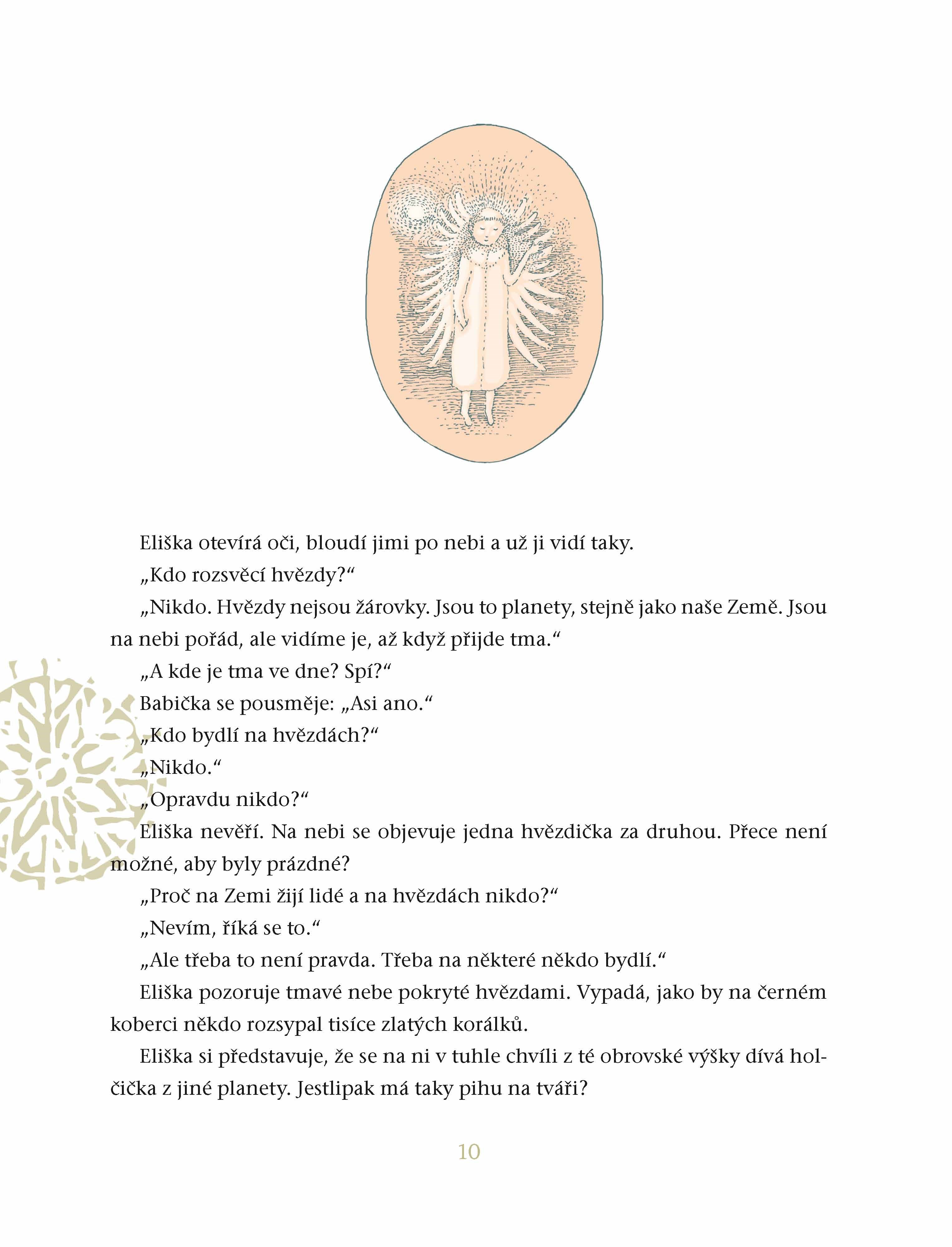 Osmiletá Eliška neví co dřív. Péct cukroví, vyrábět vánoční řetěz, nebo psát dopis Ježíškovi? Kvapem se totiž blíží Vánoce! A Eliška netrpělivě čeká na sníh. Konečně se z nebe snáší první vločka a s ní Eliška spatří – padat chlapce s křídly! Žuchne na zahrádku přímo pod její okna. Kdo by se nepostaral o ztraceného unaveného anděla? Chlapec s podivným jménem Ryel však netuší, co jsou Vánoce, a nechová se láskyplně, jak by se očekávalo. Je to vůbec anděl?