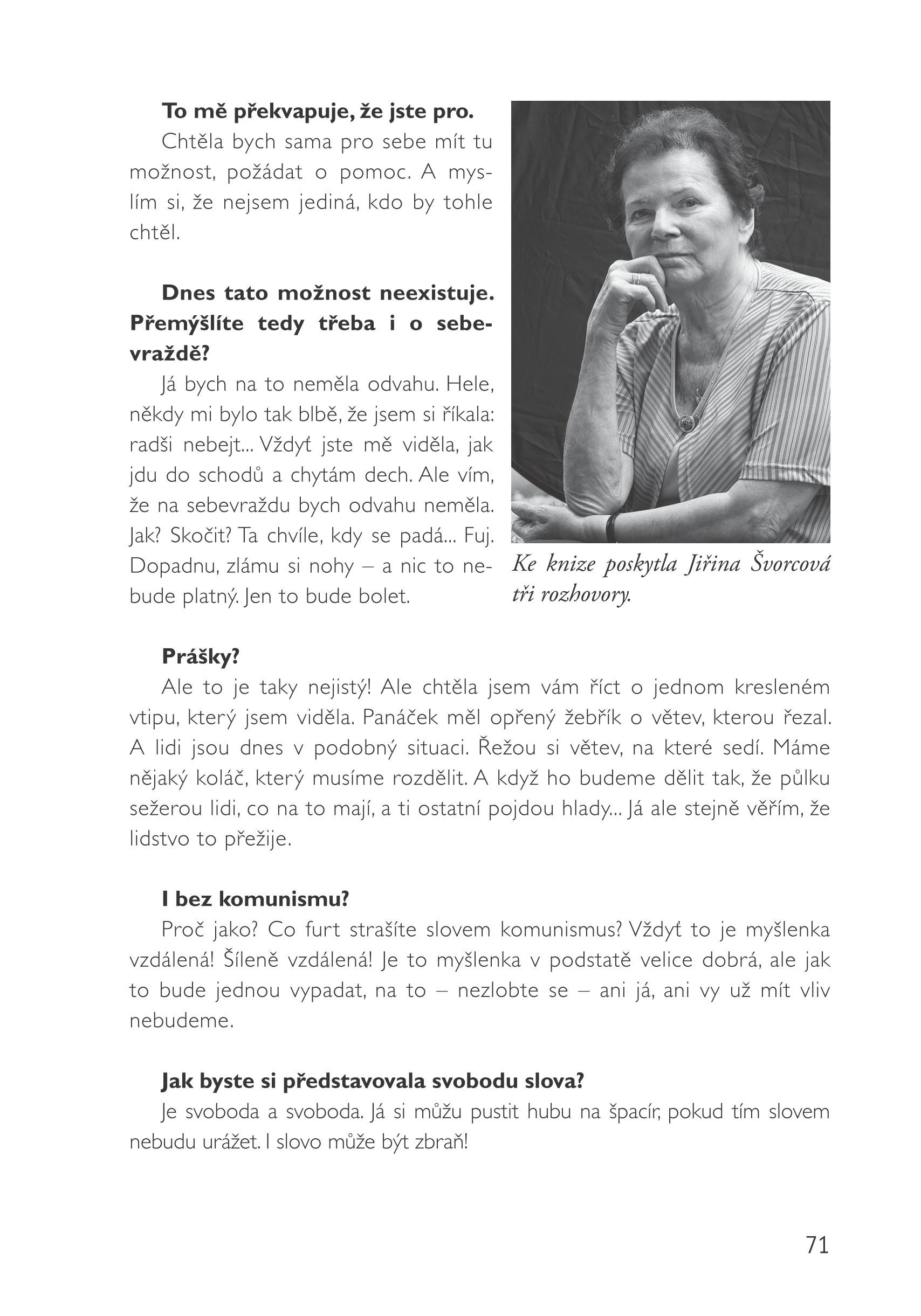 Volné pokračování knihy Jiřina Švorcová osobně, která se stala bestsellerem, mapuje poslední rok života známé herečky a političky, připomíná významné momenty celé její kariéry a předkládá rozhovory, které Jiřina Švorcová poskytla v minulosti i těsně před svou smrtí, a politické projevy, jež sepsala a přednesla, včetně takzvané Anticharty. Významnou součástí knihy je také rozhovor s Václavem Švorcem, jejím bratrem, který již léta žije v ústraní.