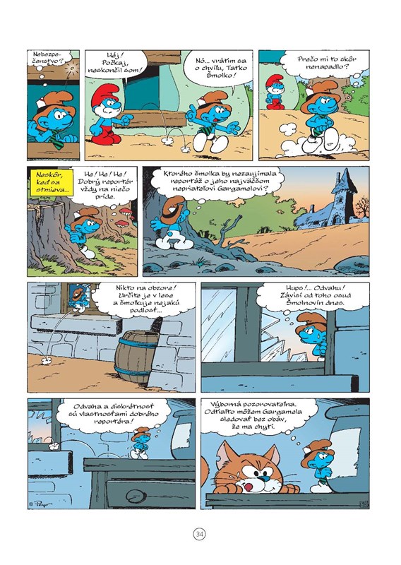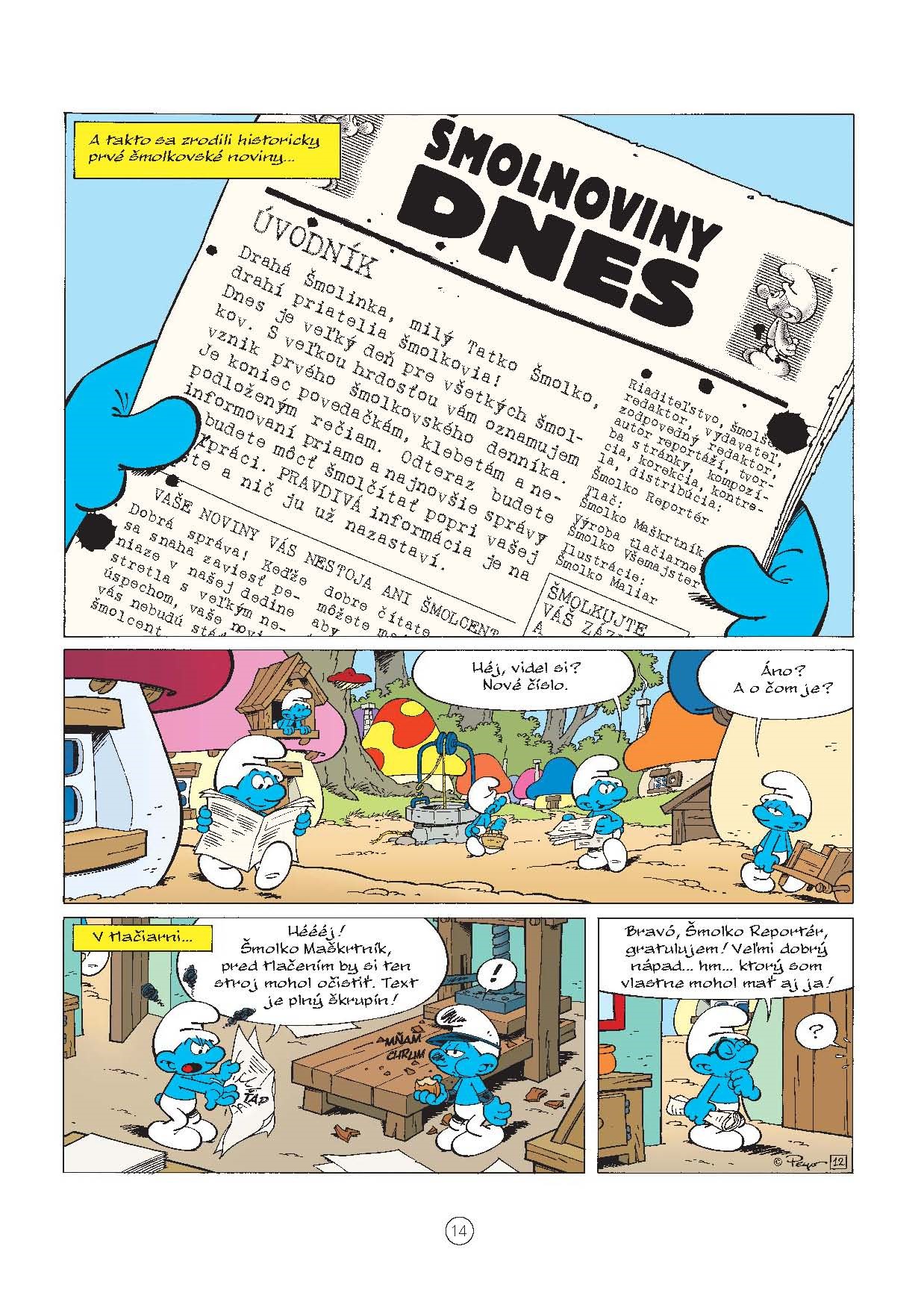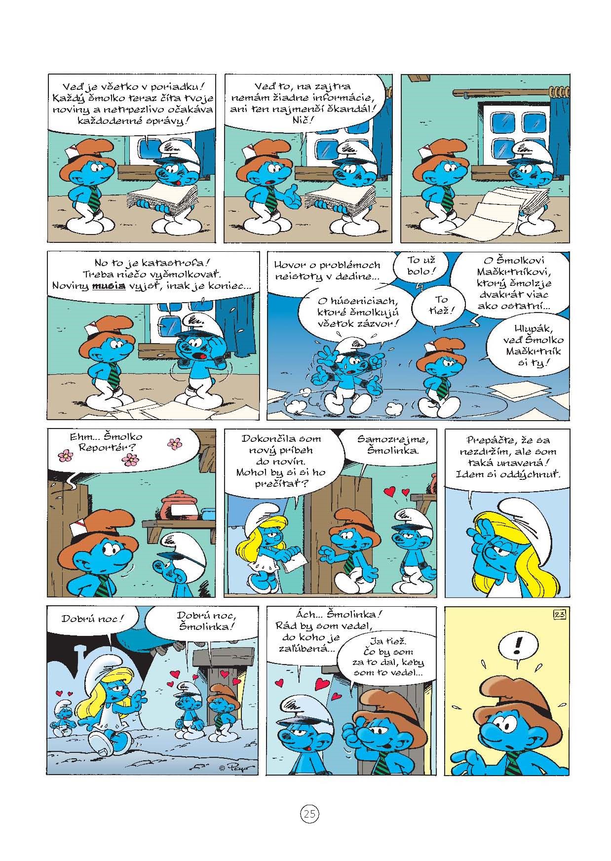 Nový šmolkovský komiks s veselým príbehom a množstvom farebných obrázkov! Aj v dedine šmolkov sa vždy niečo zaujímavé udeje a všetci sú zvedaví na najnovšie klebety. Šmolko Reportér nezaváha a hneď sa pustí do tvorby šmolkovských novín. Senzácia je to obrovská, všetci noviny milujú... až na tých, o ktorých sa tam nepekne píše. Ale čo sa stane, keď dôjdu všetky pikantné informácie...? Šmolko Reportér musí zažiť to najväčšie nebezpečenstvo na vlastnej koži, aby mal o čom písať. Vyberie sa do domu Gargamela...