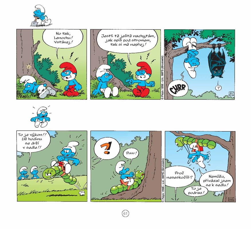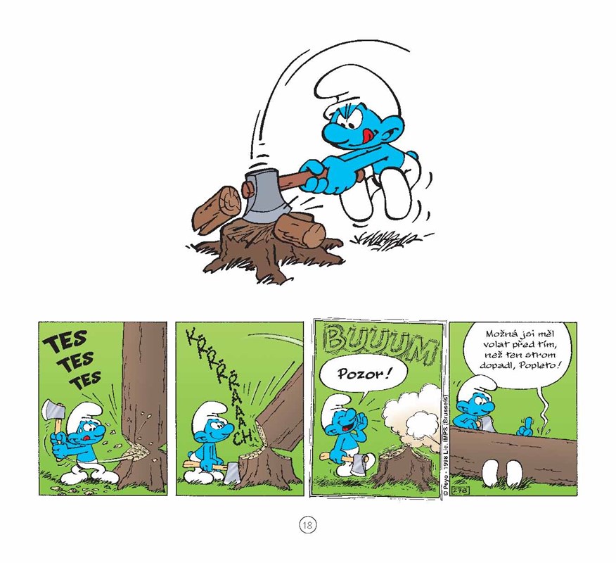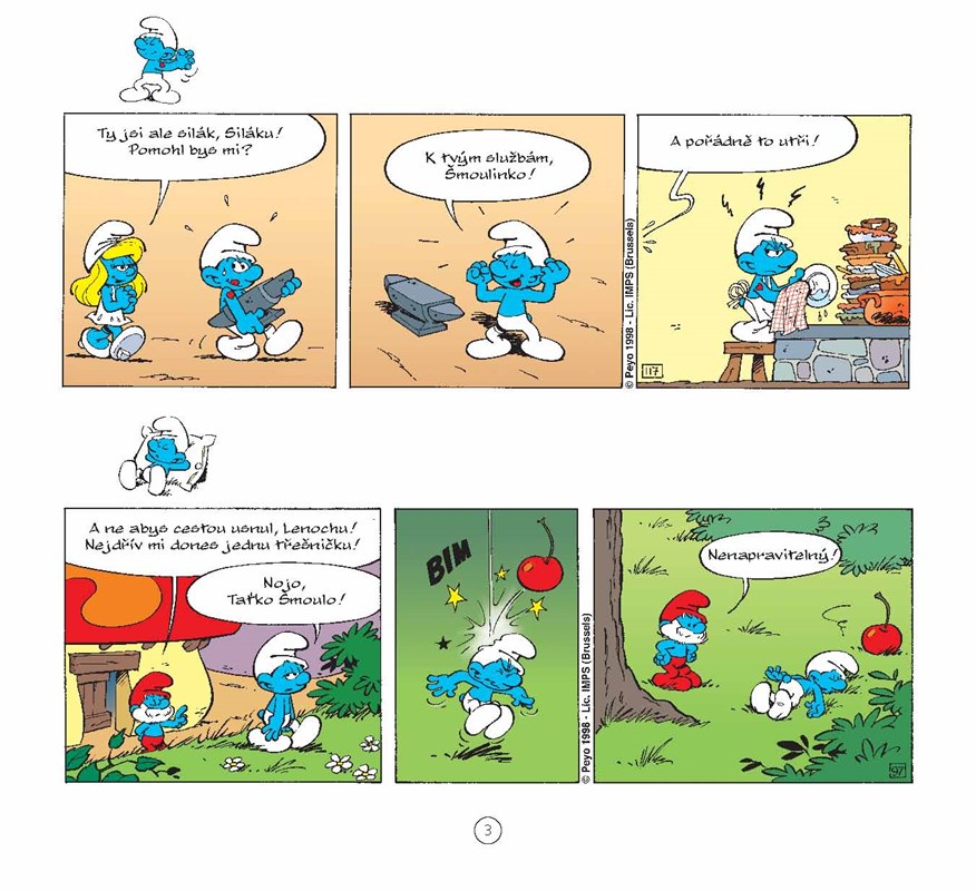 Nejnovější šmoulí knížka obsahuje 120 komiksových stripů, v nichž šmoulové zažívají samé veselé příhody.