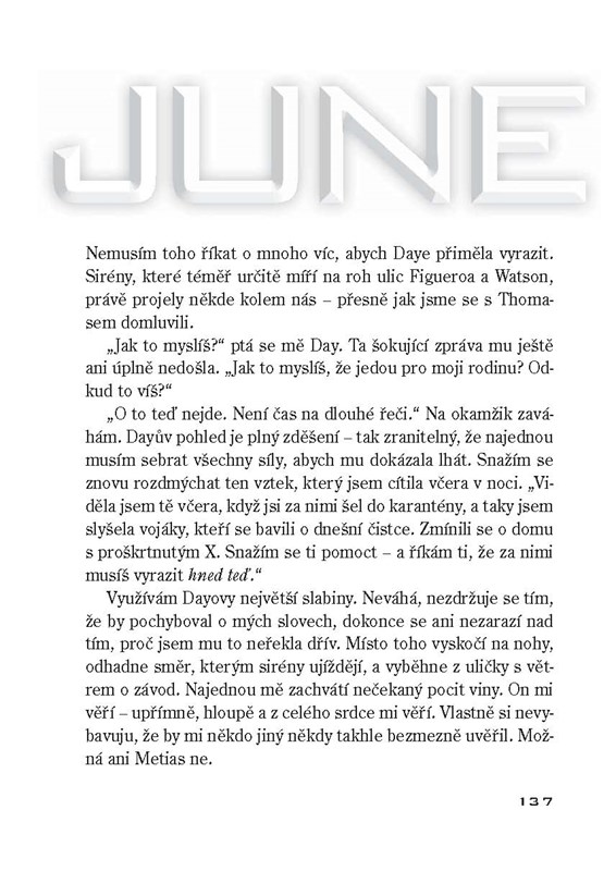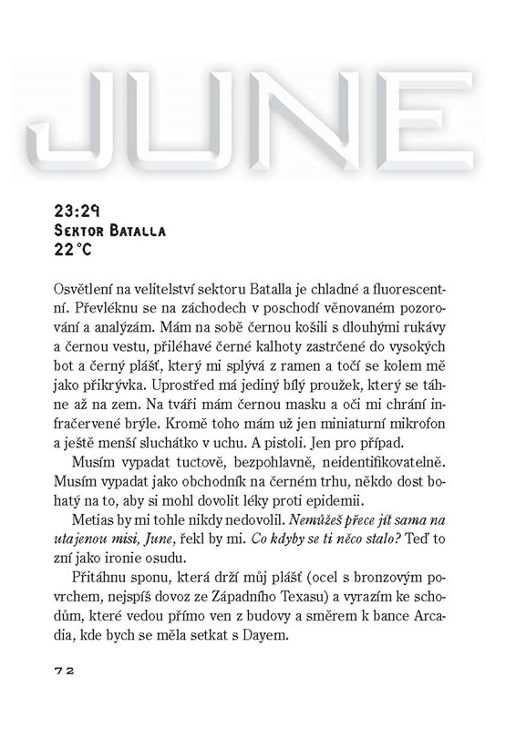 Oba pocházejí z naprosto odlišných světů a zdá se, že neexistuje důvod, proč by se jejich cesty někdy měly zkřížit. Ovšem pouze do doby, než je zavražděn Metias, bratr Juny, a než se Day stává hlavním podezřelým. Rozpoutává se hra na kočku a myš, v níž se Day snaží ochránit svou rodinu a June pomstít smrt bratra. Ale při šokujícím zvratu událostí oba odhalí, co je ve skutečnosti postavilo proti sobě. Nyní nastává boj o holý život, boj o budoucnost lidstva, boj o skutečnou lidskou svobodu.
