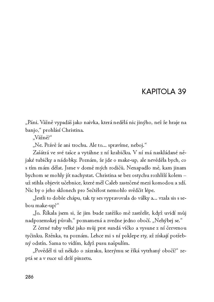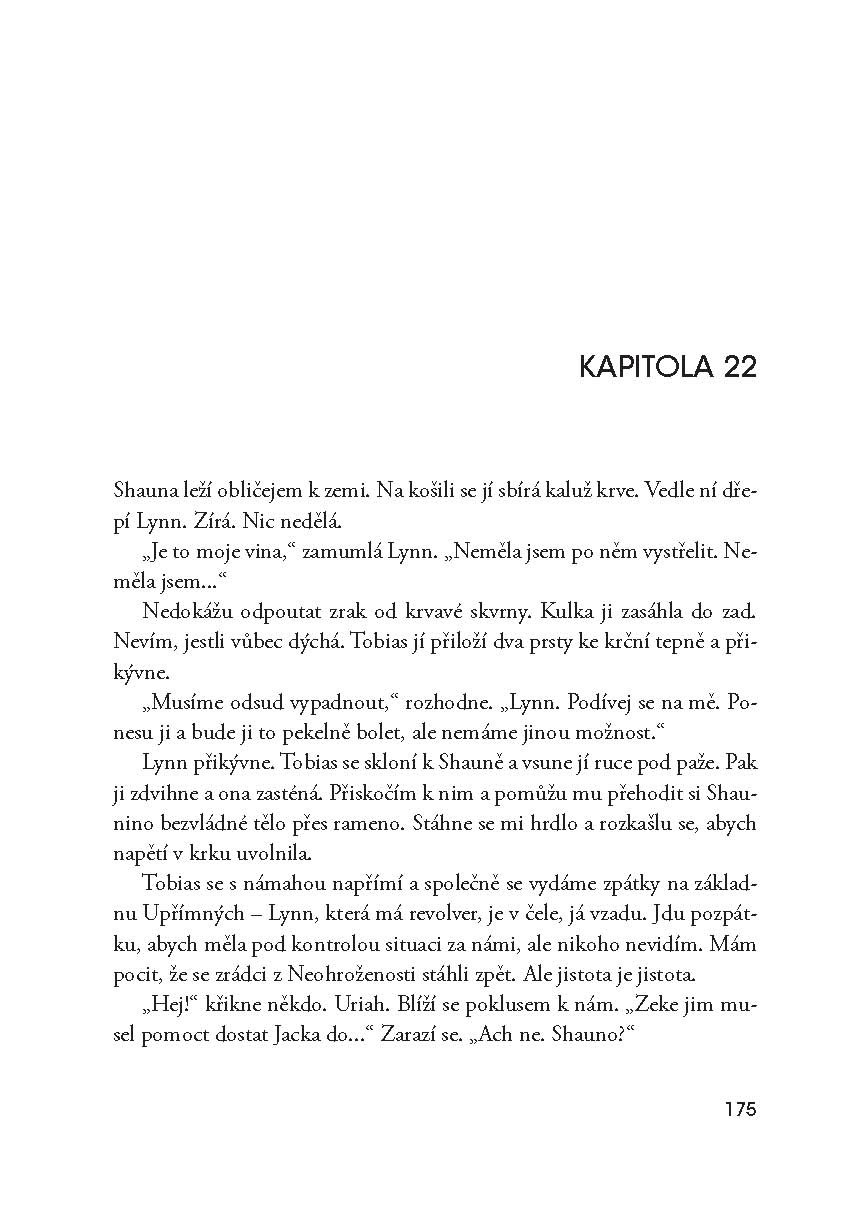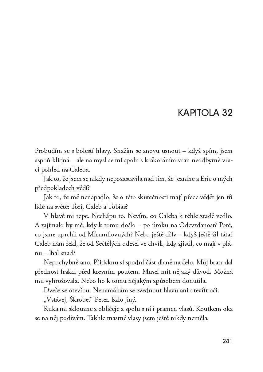 Měl to být pro Tris šťastný a slavnostní den, ale všechno dopadlo úplně jinak. Po krvavé tragédii mezi frakcemi vzrůstají konflikty a nad společností se vznáší válka. Tris se musela rozhodnout už jednou – a teď ji čeká další volba. Dřívější rozhodnutí, obavy, zármutek i provinilost, to vše ji teď dostihlo a Tris nezbývá než bez výhrad přijmout svou Divergentní identitu. Dokáže se ale vyrovnat se vším, co to znamená?