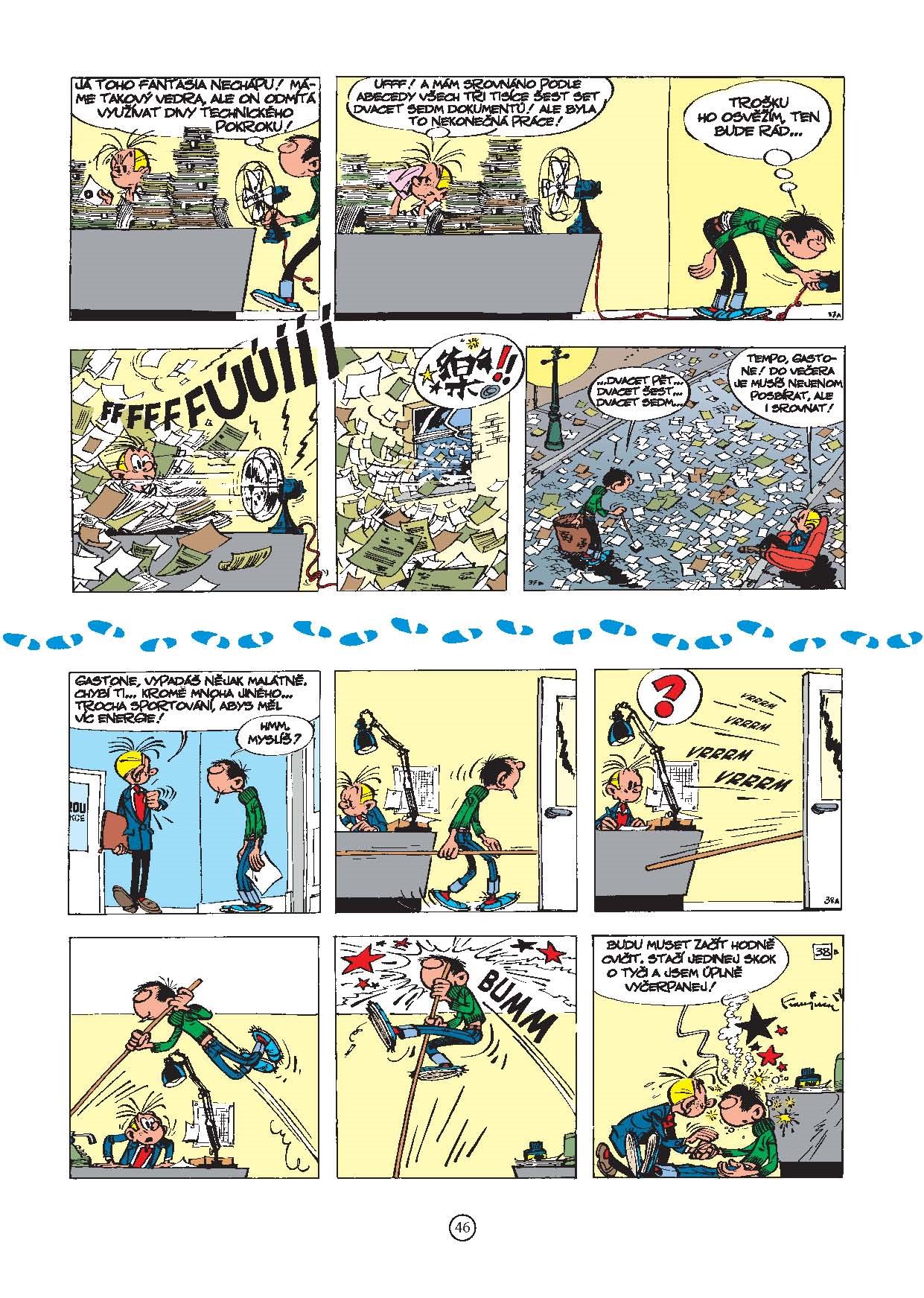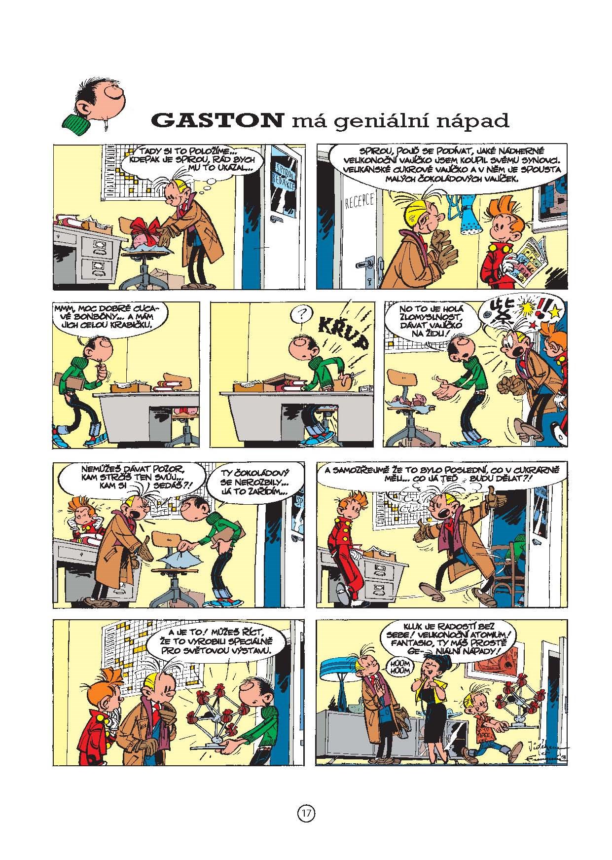 Gaston je všehoschopný a všudypřítomný pomocník a poslíček v kanceláři, který je bezmezně oddaný své práci. Je pro své šéfy pravým požehnáním nebýt toho, že jej provázejí ty největší katastrofy a průšvihy, jaké si stěží dovedeme představit. Komiksový hrdina Gaston baví francouzské čtenáře již víc jak 50 let. Vymyslel si jej belgický kreslíř André Franquin zprvu jen proto, aby zaplnil prázdné půlstrany v časopise Spirou. Jeho hrdinu si však rázem oblíbili všichni čtenáři bez rozdílu věku, a dnes bychom marně hledali ve světovém komiksu většího popletu a smolaře, než je Gaston. Českým čtenářům se představuje chronologicky ve svých prvních stripech a těší se, že získá jejich přízeň stejně, jako se to podařilo jeho rozpustilému kolegovi Leonardovi.