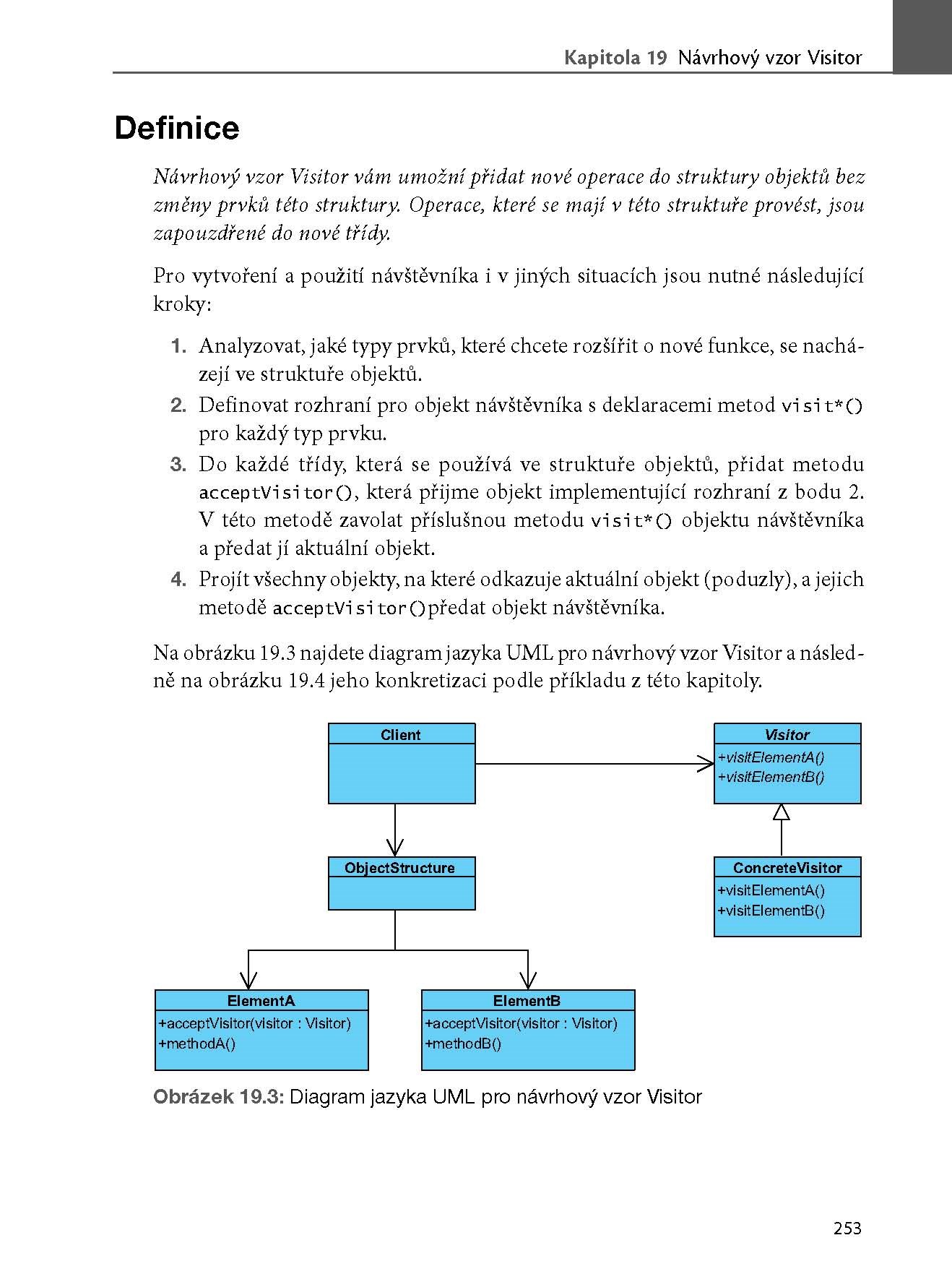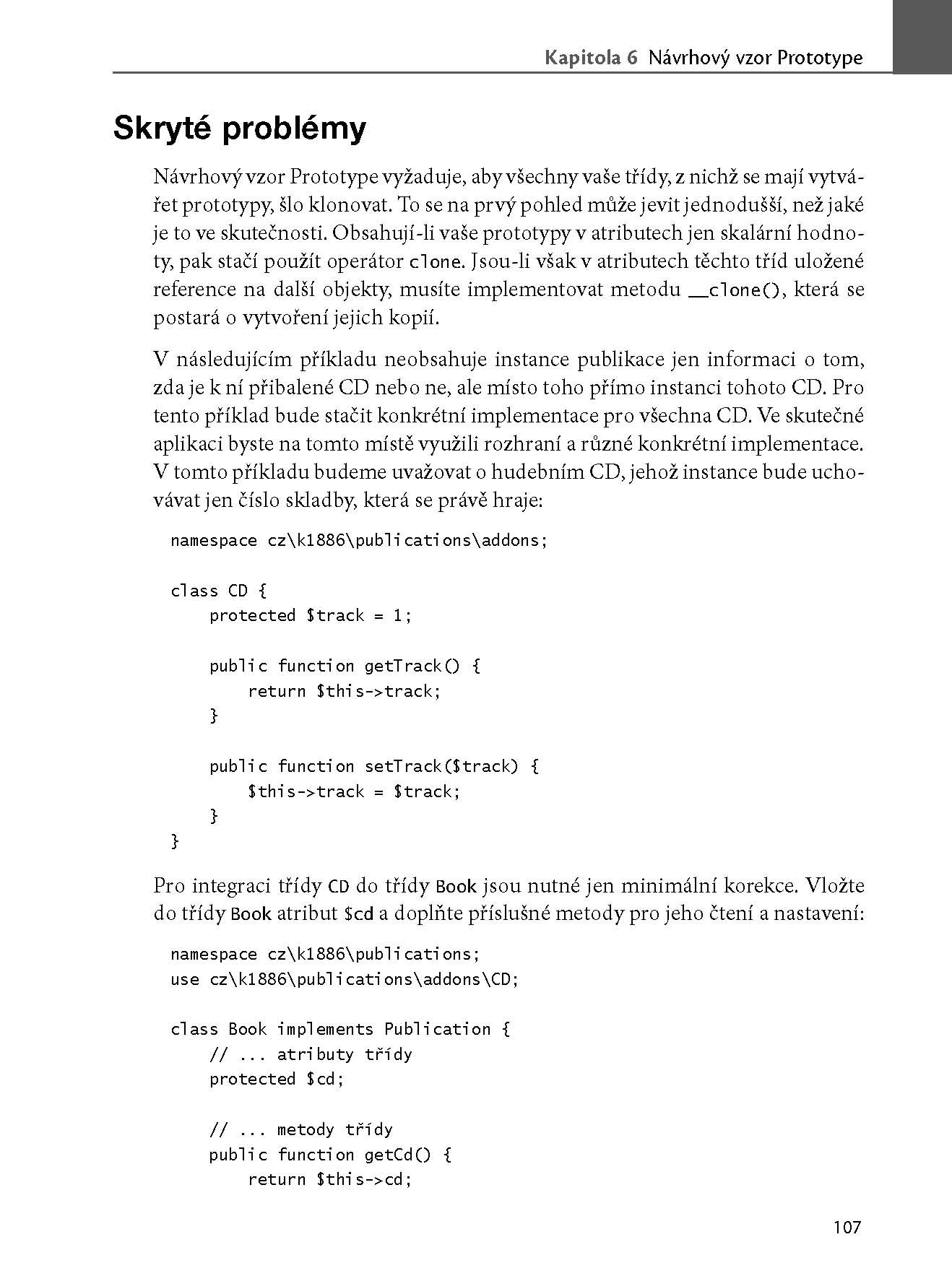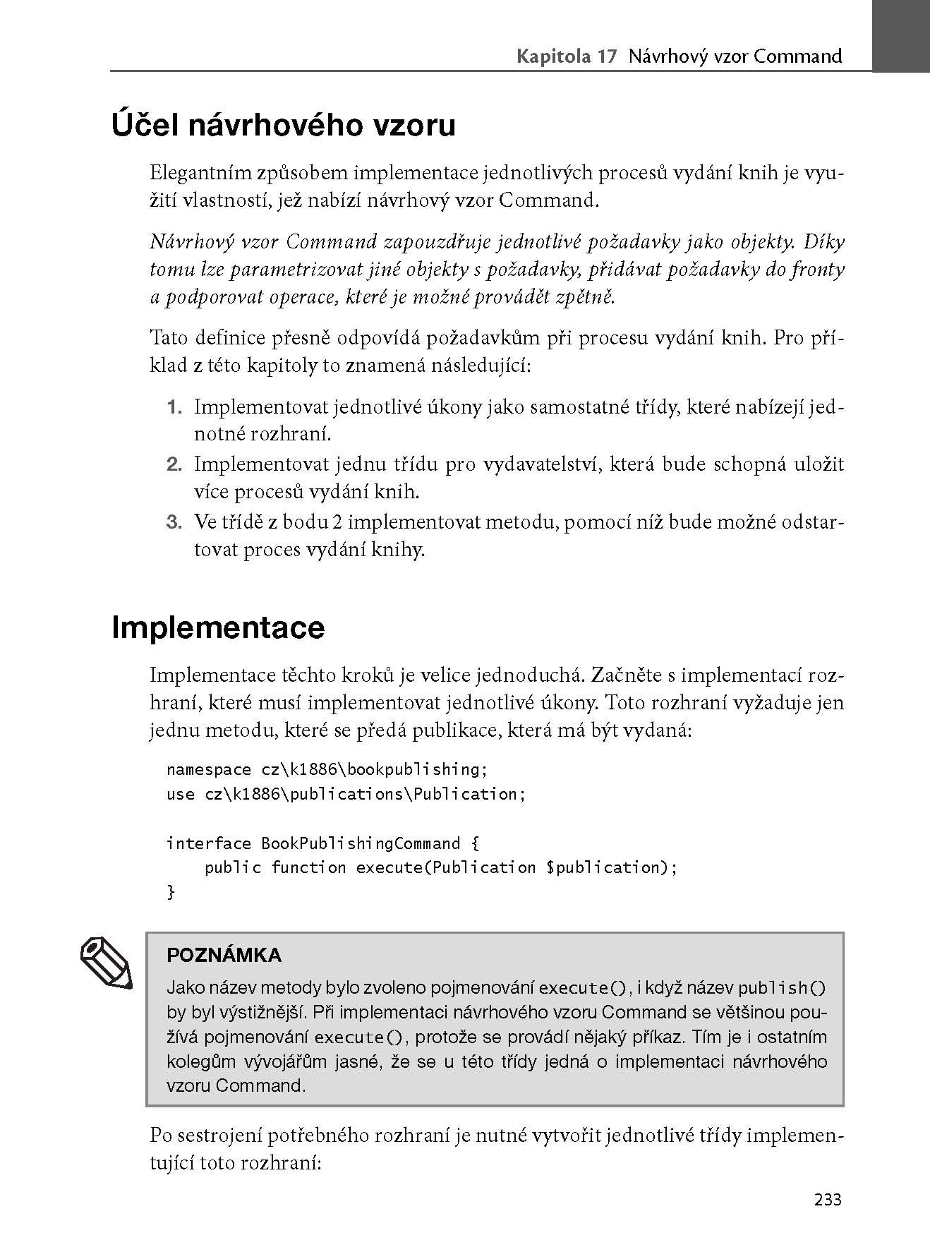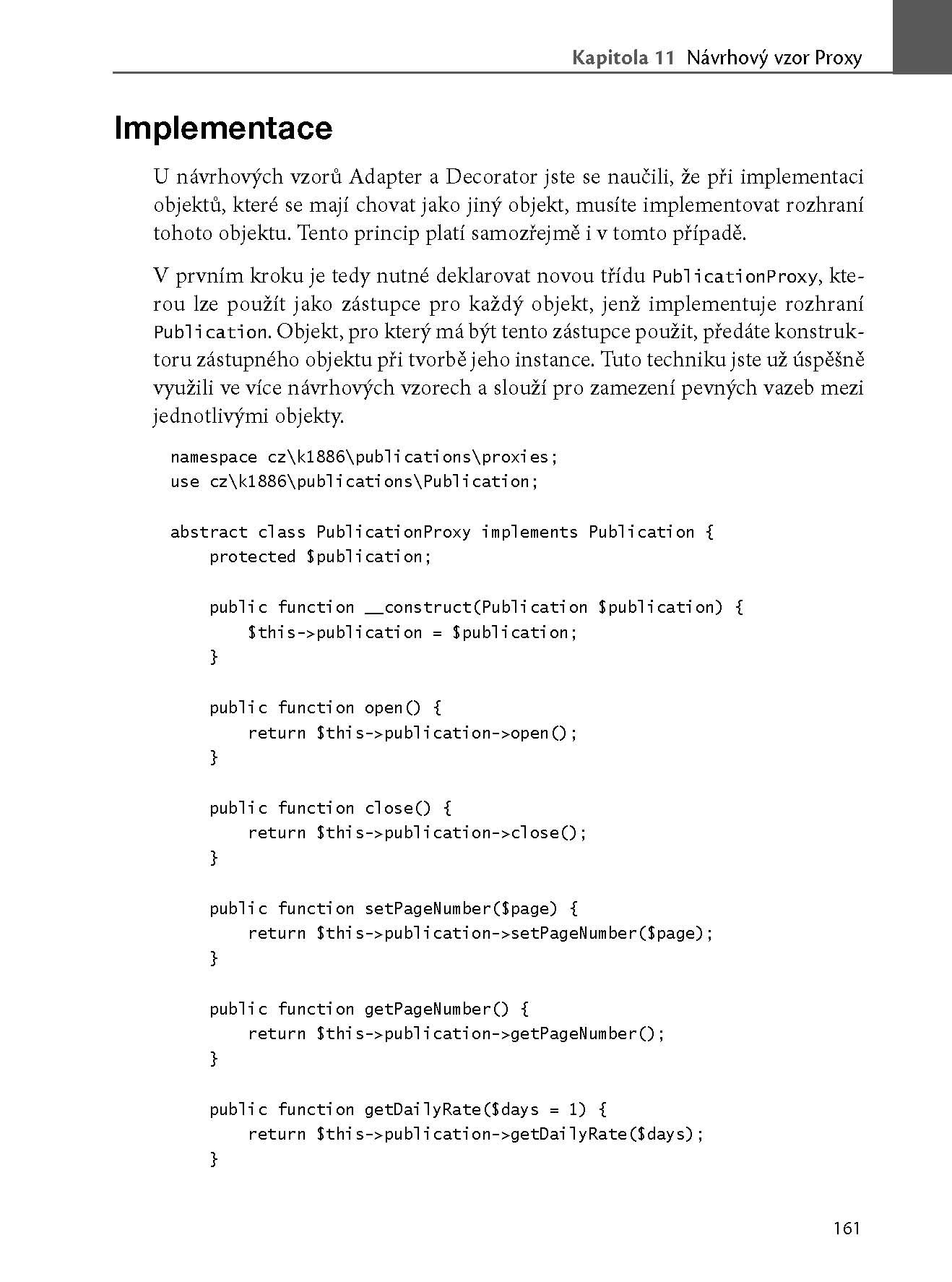 Zkušený autor vás provede 23 návrhovými vzory a u každého vás seznámí nejen s jeho klíčovými přednostmi, ale ukáže vám i ukázkovou implementaci a upozorní vás na skryté problémy. To vše na příkladech z praxe s řadou vlastních zkušeností, které v běžných příručkách nenajdete. Každému vzoru se věnuje samostatná kapitola vždy se stejnou strukturou, knihu tak můžete číst od začátku do konce, nebo ji použít jako katalog vzorů.