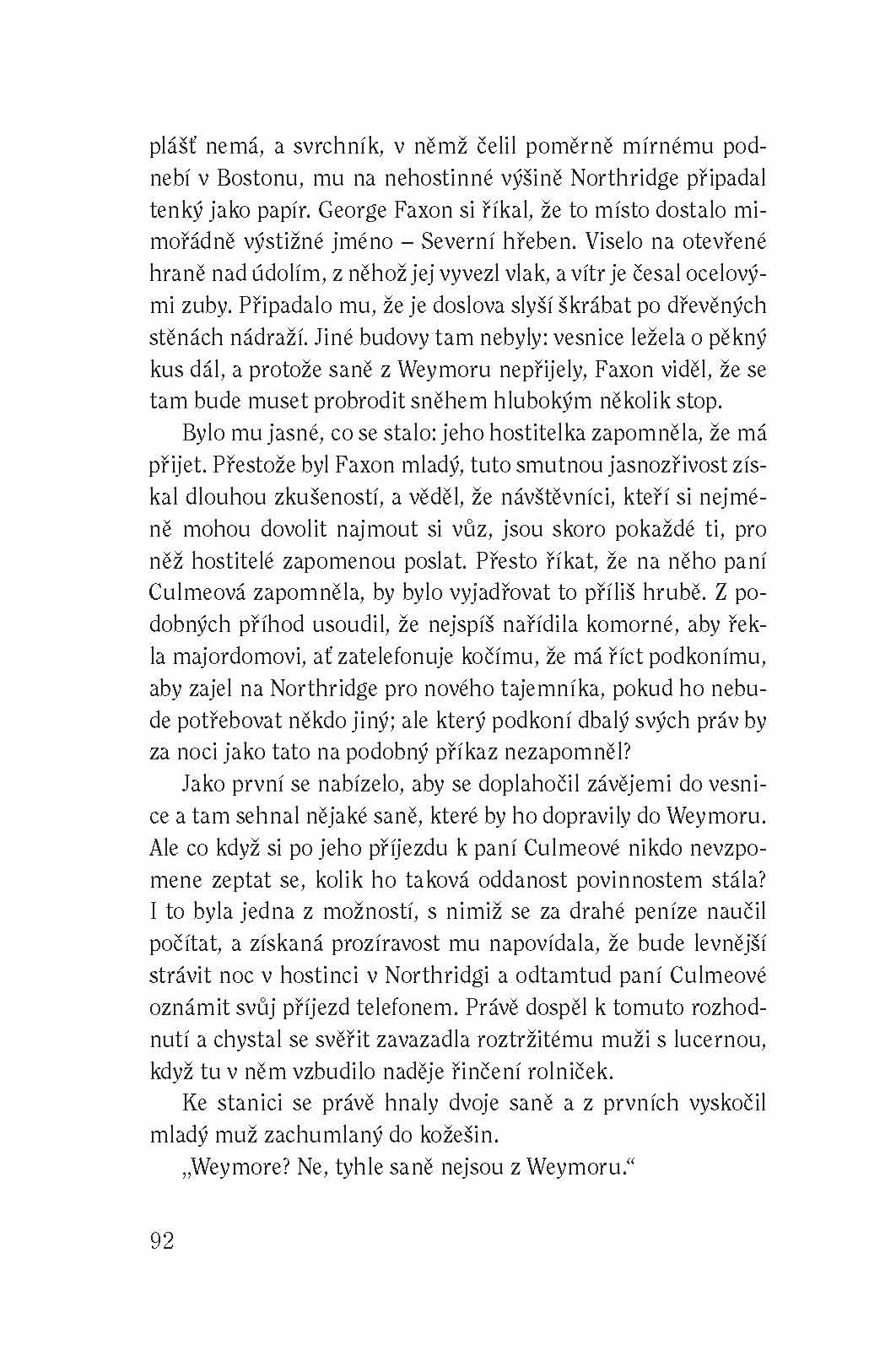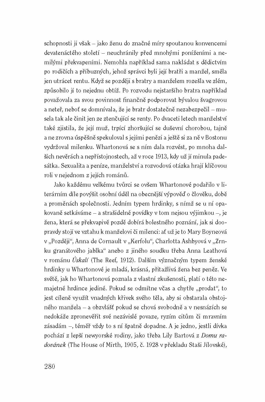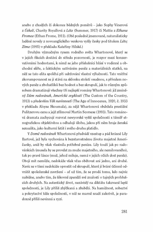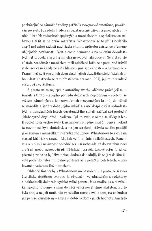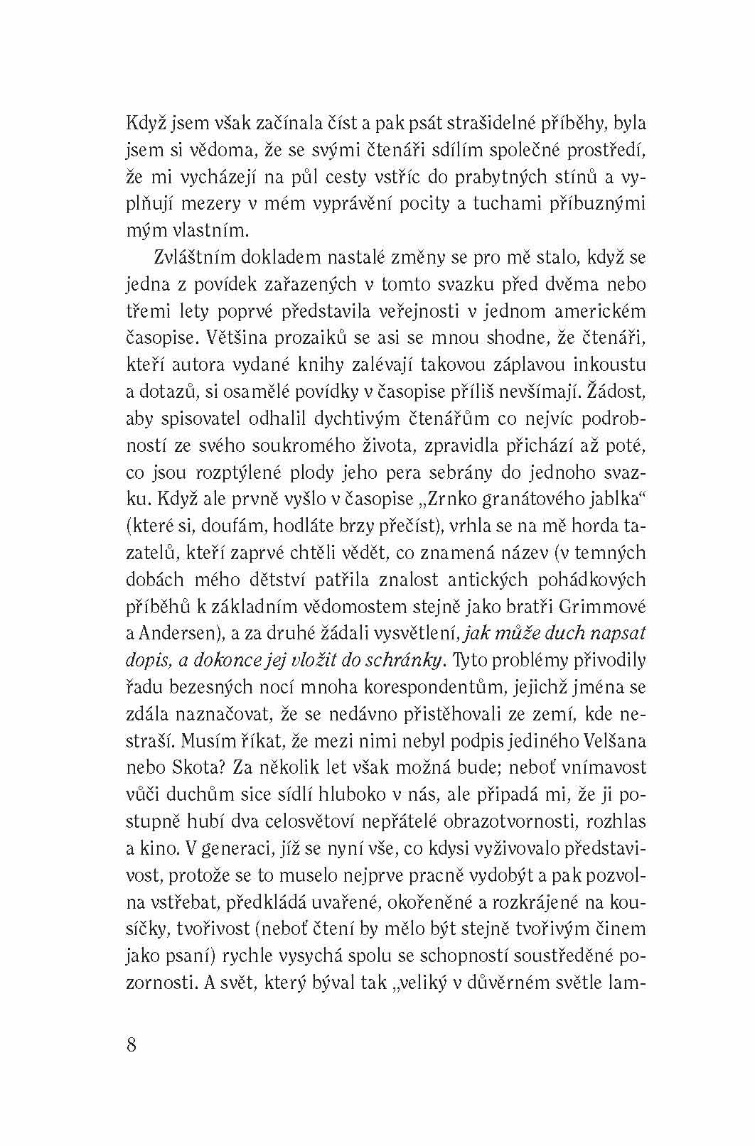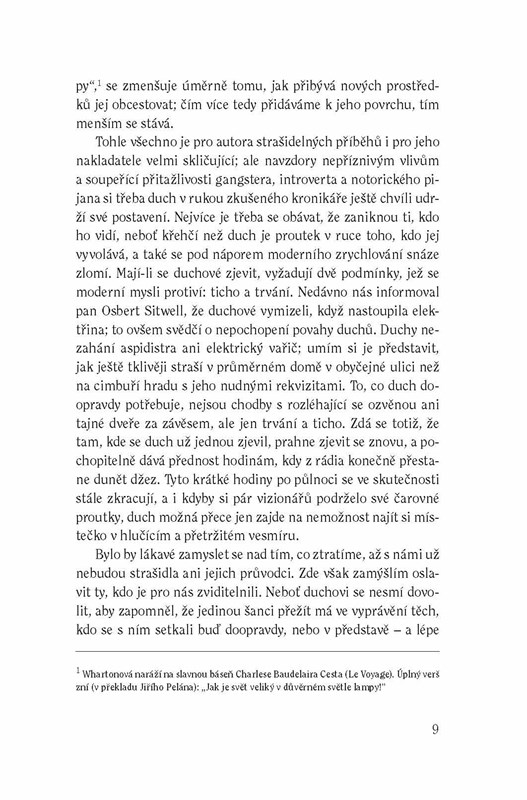 Edith Whartonová (1862-1937), držitelka prestižní Pulitzerovy ceny, je právem označována za první dámu americké strašidelné povídky. Třebaže tento žánr tvoří jen pramalou část její tvorby, autorka v něm vytvořila dílo impozantních kvalit. Především je spojovacím článkem mezi gotickou tradicí americké ghost story a moderní hororovou povídkou, v němž jsou gotické prvky rafinovaně vtěleny do kulis současnosti - moderních domů, aut, rozhlasu, ale i podnikatelského způsobu myšlení či frivolnosti ve vztazích mezi muži a ženami. Proč jsou povídky Whartonové stále moderní, jako by je autorka napsala včera a ne před více než 80 lety? Jsou strašidelné, jistě, ale jsou víc než to, daleko spíše strachuplné, jsou více o strachu - iracionálním a všudypřítomném - než o strašidlech. A povídky Whartonové jsou plné obav - obav z plíživé nemoci, ze smrti, z temnoty za zdmi našeho domova, obav z druhého, obav z toho, že každý náš vztah zůstane vposledku nejasný a nenaplněný. A ještě jednomu autorčinu mistrovství se můžeme obdivovat: její povídky jsou završené začasté nečekaným finále, jak se na tento žánr sluší, a přesto zůstávají dvojznačné, těžko vyložitelné, takže se k nim čtenáři vracejí znovu a znovu. Tento výbor přináší v češtině vůbec poprvé v jednom svazku to nejlepší, co Whartonová v tomto žánru vytvořila.