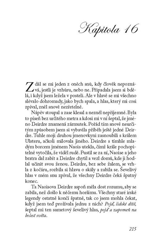 Pro šestnáctiletou Deirdre Monaghanovou jsou v životě důležité jen dvě věci: její harfa a nejlepší kamarád James. Pak se ale zúčastní zcela obyčejné hudební soutěže, jakých absolvovala už desítky, a náhle se kolem ní začnou dít zvláštní věci. V trávě roste příliš čtyřlístků a všude se objevují záhadní krásní cizinci, které často nikdo kromě ní ani nevidí. Zdá se, že bytosti, které dosud znala jen z pohádek, jsou skutečné a ona má s nimi něco společného… Jenže ne všechny pohádky mají šťastný konec. Zdá se, že Deirdre bude muset o svou hudbu, své blízké i svou novou, nečekanou lásku z jiného světa svést velice nerovný boj se silami, jimž jsou lidské city zcela lhostejné. Otázkou není, zda něco ztratí, ale zda toho neztratí až příliš.