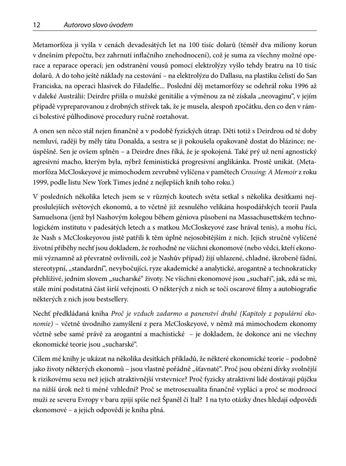 Proč jsou obézní dívky svolnější k rizikovému sexu než jejich atraktivnější vrstevnice? Proč fyzicky atraktivní lidé dostávají půjčku na nižší úrok než ti méně vzhlední? Proč se metrosexualita finančně vyplácí a proč se modroocí muži ze severu Evropy v baru zpijí spíše než Španěl či Ital? I na tyto otázky dnes hledají odpovědi ekonomové – a kniha Proč je vzduch zadarmo a panenství drahé je plná odpovědí.