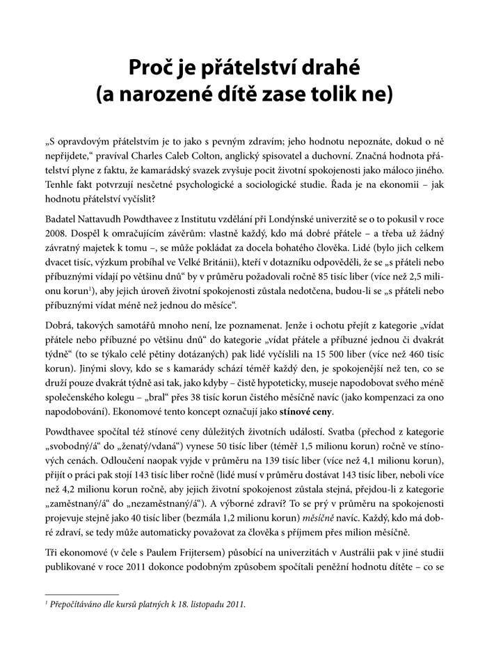 „Kovandovy črty na pomezí ekonomie, sociální psychologie, sociobiologie a antropologie vyplňují citelnou mezeru v domácí popularizační literatuře, jež zoufale zaostává za produkcí zejména anglosaskou, která nás sice svým šarmem oslňuje v překladech jako Špekonomie (Dubner a Levitt) či Proč muži neposlouchají a ženy neumí číst v mapách (Allan a Barbara Peasovi), ale postrádá autenticitu domácího původu.“