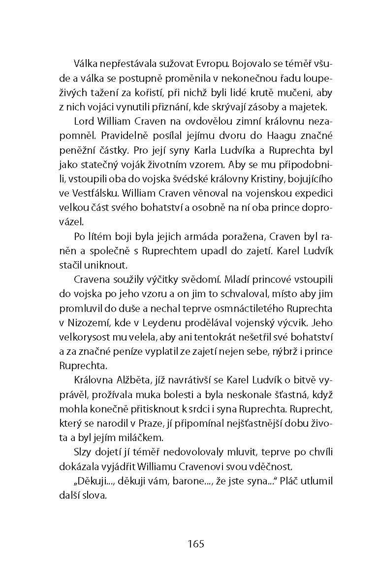 Na pozadí historických událostí z období třicetileté války vypráví autorka životní příběh mladé princezny, která se provdala z lásky za falckého kurfiřta a doprovázela ho do Čech, poté co mu byla nabídnuta česká koruna. Jeho vláda však byla jen krátkou epizodou a z královských manželů se záhy stali vyhnanci. Alžběta však po boku milovaného manžela stála i v těžkých dobách, kdy bloudili po Evropě a hledali azyl pro sebe a pro své děti. Svou krásou a vlídností si získala mnoho přátel a ctitelů. Po Fridrichově předčasné smrti se jeden z nich, o dvanáct let mladší anglický důstojník lord Craven, stal její životní oporou. Vztah měl skončit sňatkem, ale osud rozhodl jinak…