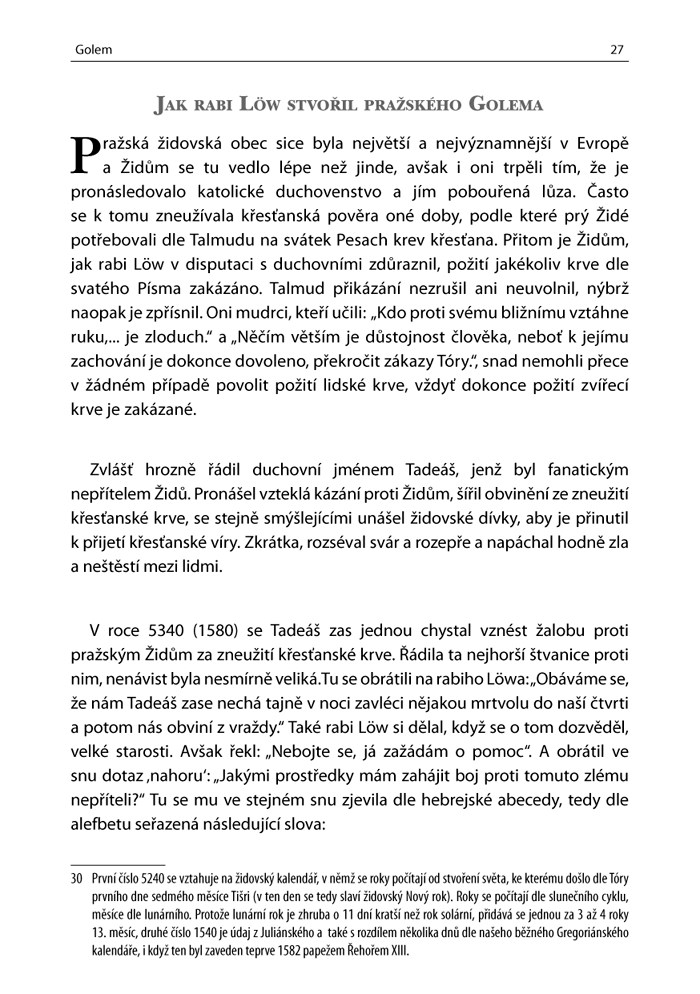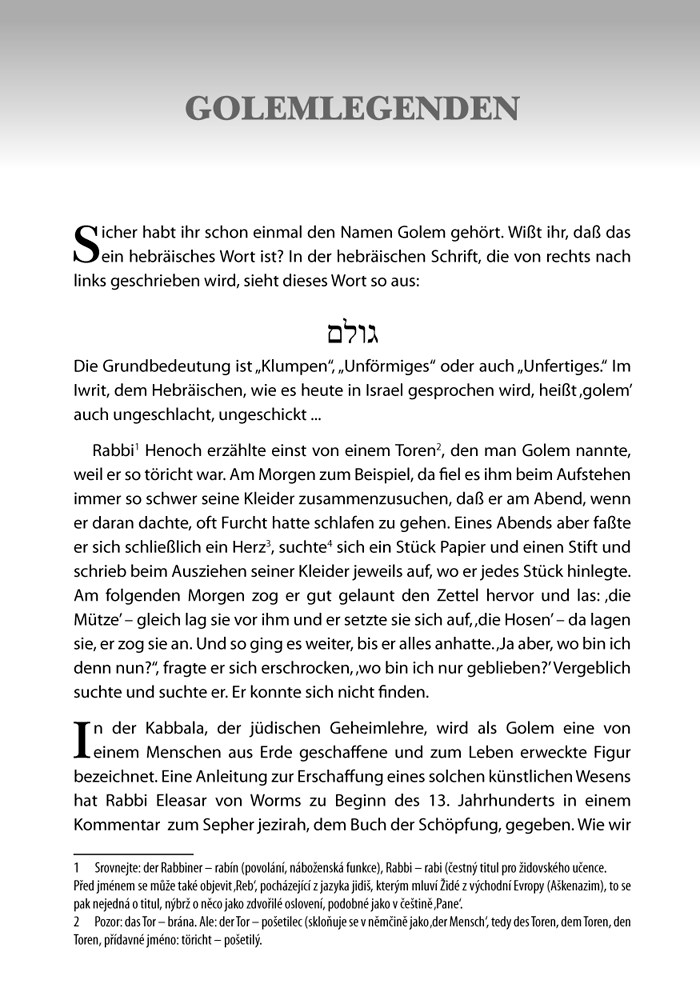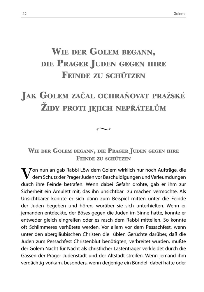Kniha obsahuje věrně převyprávěné legendy o této tajuplné postavě, a to v jazyce německém i českém. V textu a v poznámkách se dozvídáte rovněž o dějinách a zvyklostech Židů. Ke knize je přiloženo CD, na které namluvil autor německou část textu. Můžete se tak učit německy i česky. CD obsahuje nahrávky ve formátu MP3.