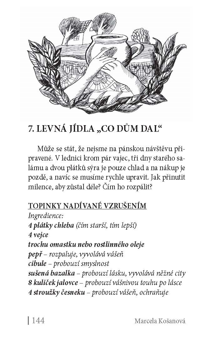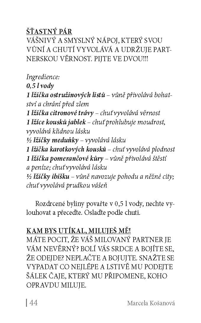 Nová kniha známé čarodějky Marcely Košanové potěší své čtenářky jedinečnými radami pro čarování v kuchyni. Jeho základem je znalost síly bylin a jejich kombinací. Víte třeba, že bazalka, heřmánek, kopr, ibišek, levandule, ale i fazole nebo hrách přinášejí lásku? Recepty na bylinné koupele, čaje, aperitivy, ale také polévky, hlavní jídla a čarodějnické nápoje jsou zde jen pro inspiraci, protože každá čarodějka může obyčejné jídlo proměnit bylinami v jídlo kouzelné. Pomůže k lásce, ke štěstí, úspěchu i zdraví. A až si budete chtít od vaření odpočinout a pobavit se, nabízí kniha několik příběhů osobitě zachycujících osudy žen.
