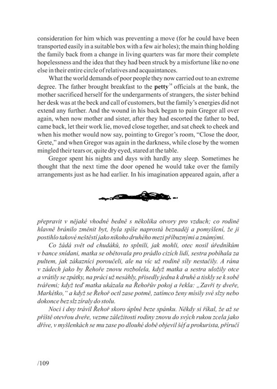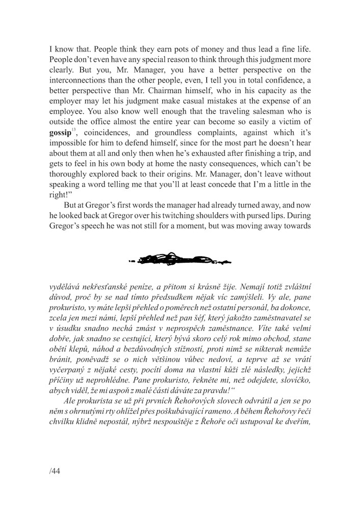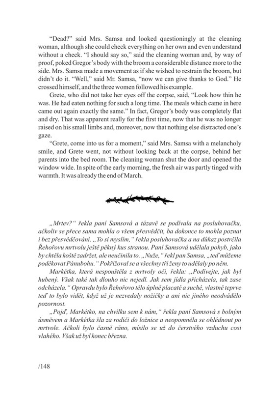 V naší publikaci naleznete anglický a český překlad povídky. Nejsou zcela identické a bude jistě zajímavé porovnat, jak si který z překladatelů s původním německým textem pohrál. Nicméně čeština Vám jistě pomůže tam, kde Vám bude angličtina připadat nesrozumitelná. Věříme, že si z obou překladů mnohé odnesete a kromě čtení samotného se přiučíte i něčemu novému v anglickém jazyce. Anglický text si můžete poslechnout na přiloženém CD. CD obsahuje nahrávky ve formátu MP3. V publikaci také naleznete jazykové komentáře.